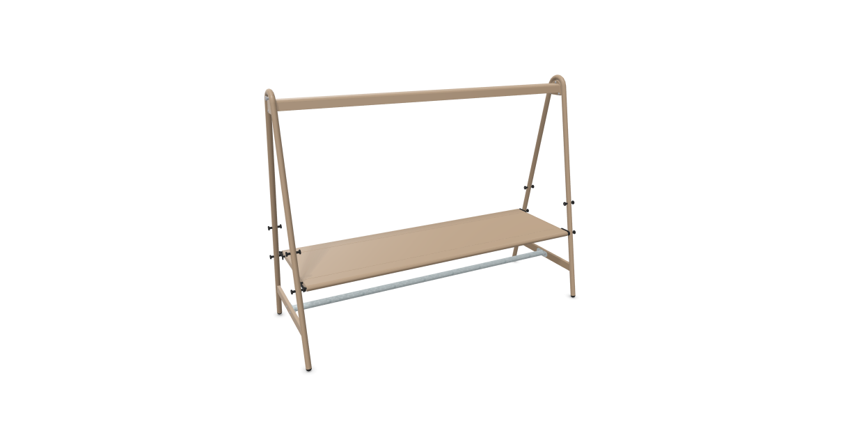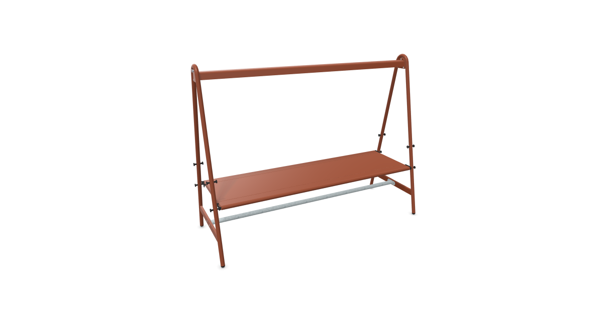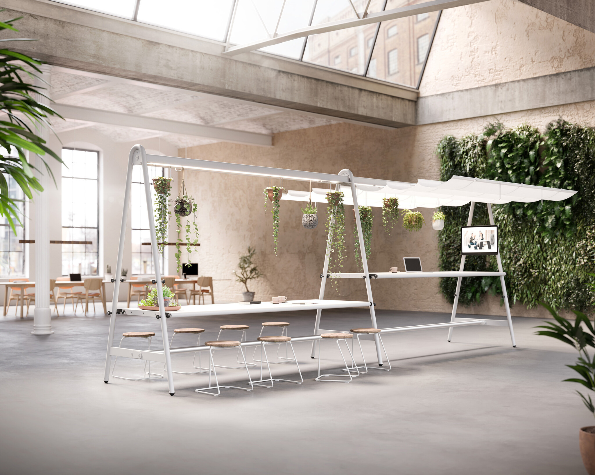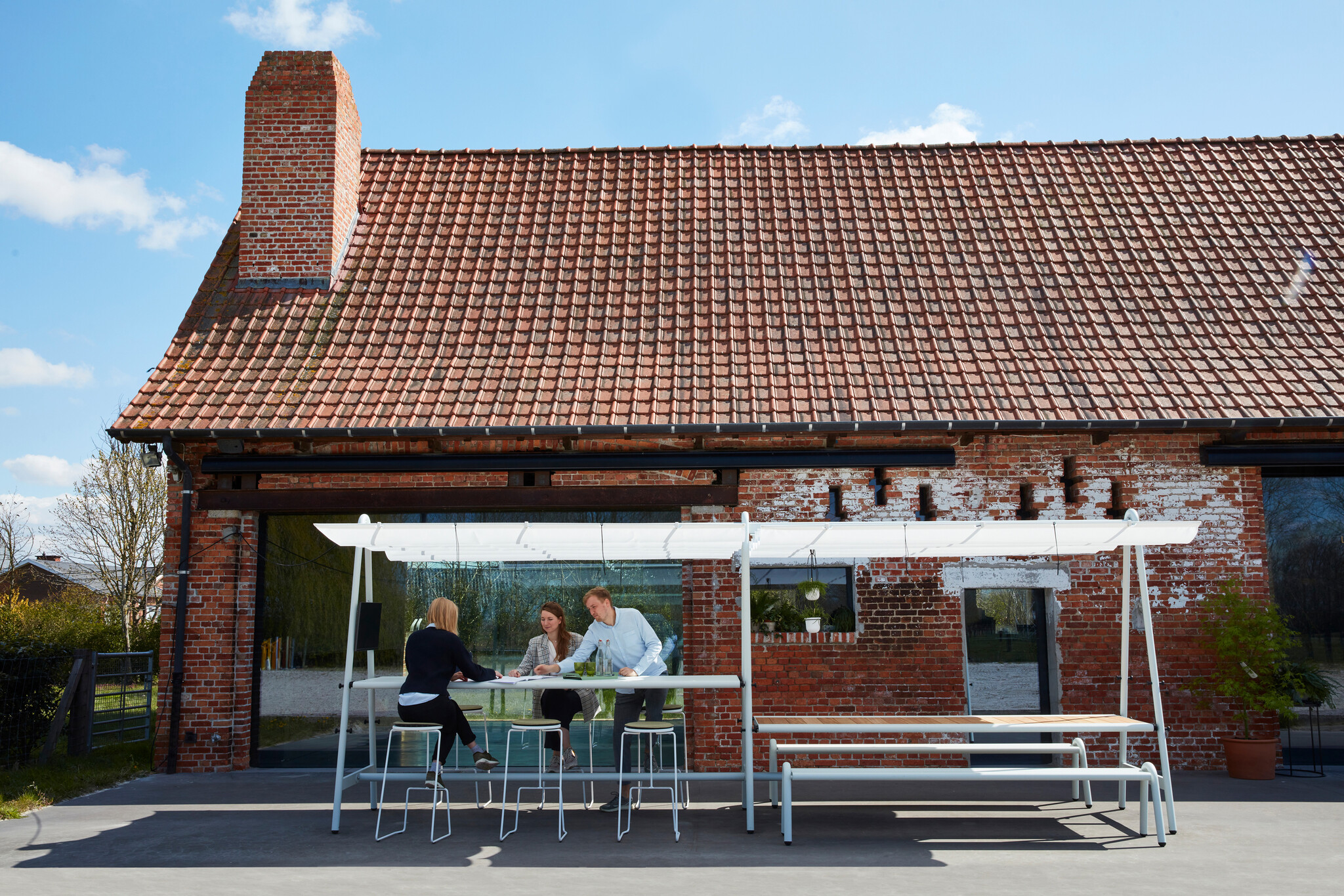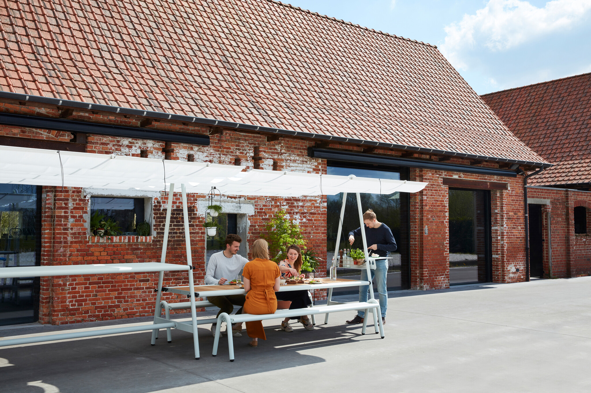 The AMAi is the ultimate flexible table for indoor and outdoor use. Two A-shaped frames create a sturdy base, with the tabletop adjustable to standard or high height. Its innovative design allows effortless solo height adjustments. Mix finishes and accessories, add LED lighting or power outlets, and use the sunshade for sun or rain protection. One table seats 8, and adding extra A-frames expands the capacity endlessly.