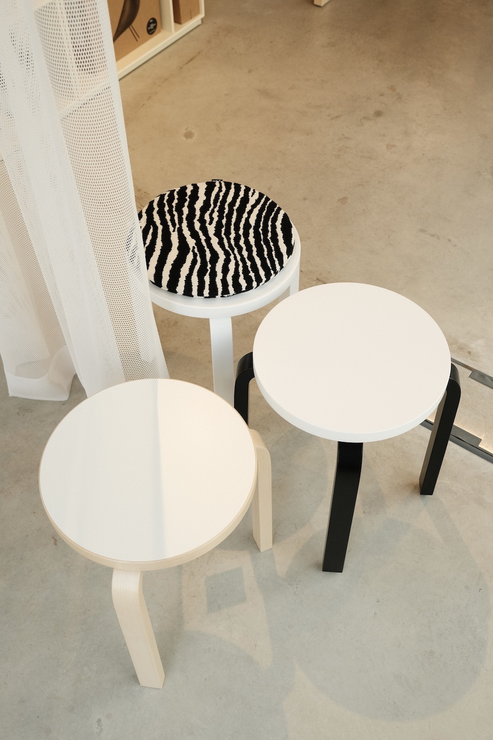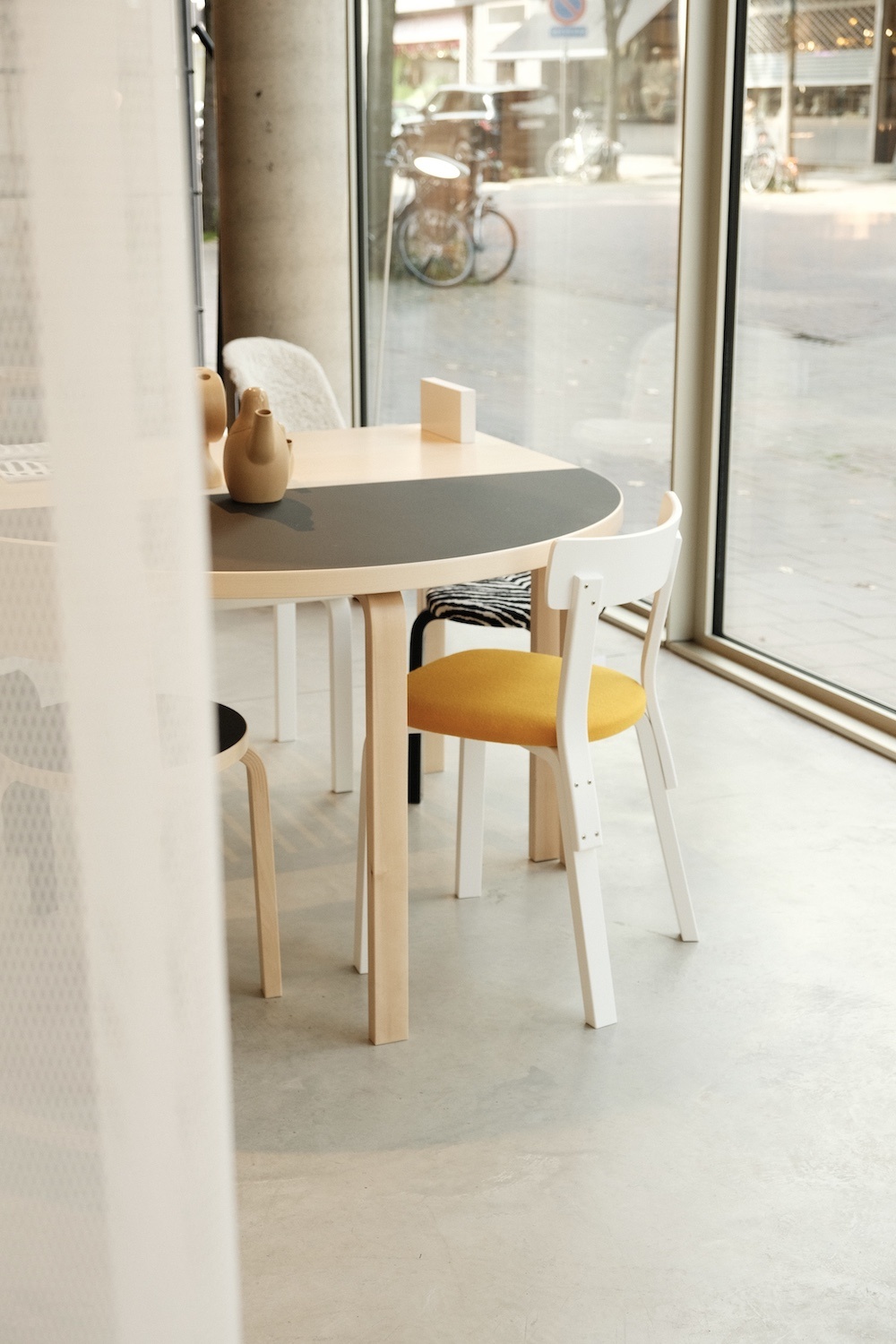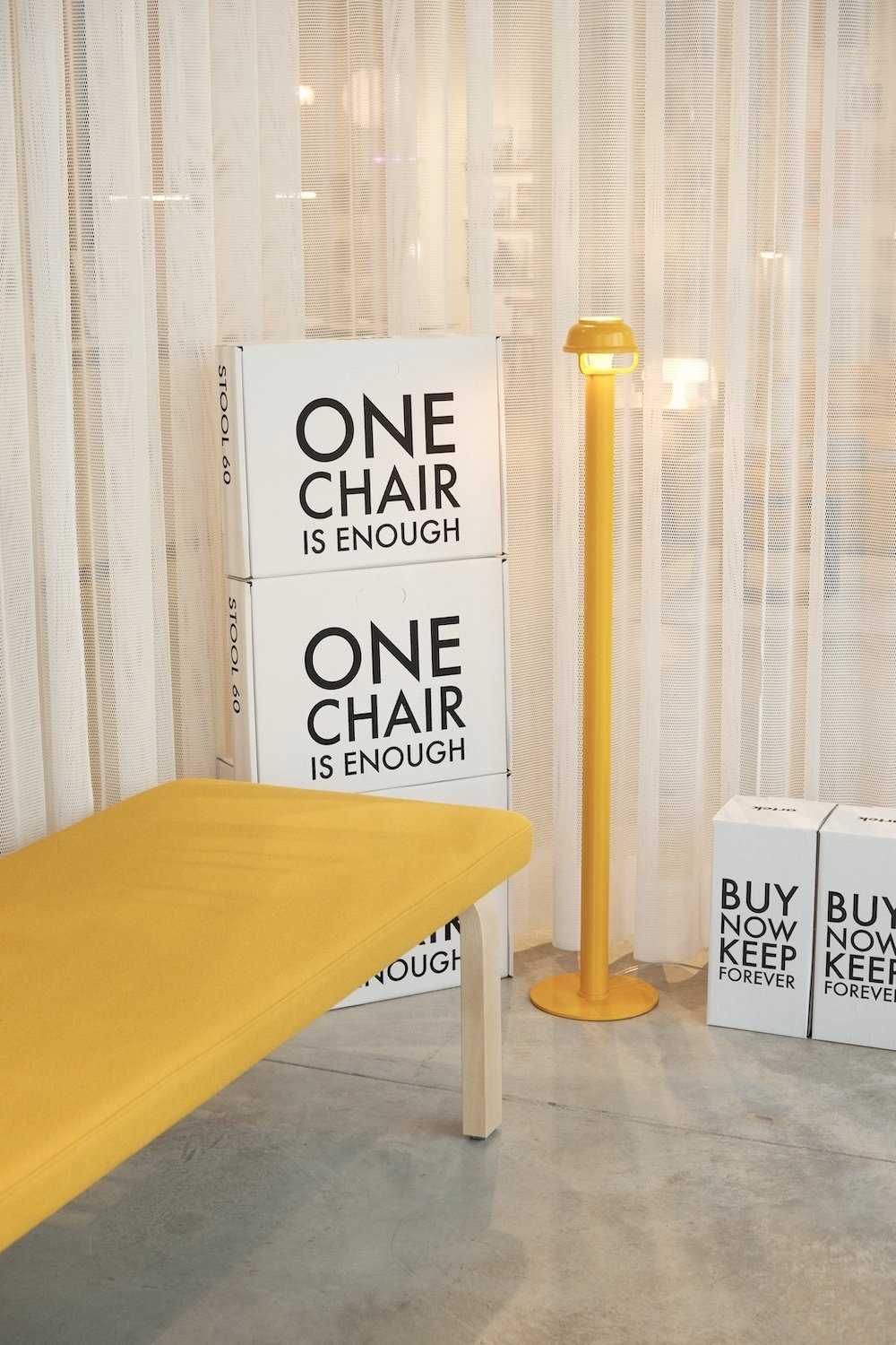 Our concept is built around three prominent visuals. Firstly, the dark yellow colour of the Kori Light. Next, the iconic zebra pattern, introduced into the Artek collection in 1935 after Aina Aalto discovered the pattern on her European travels, and created by Bauhaus weaver and designer Otti Berger. Exotic and striking! And lastly, the material Artek is known for: birch, straight out of the Finnish woods.