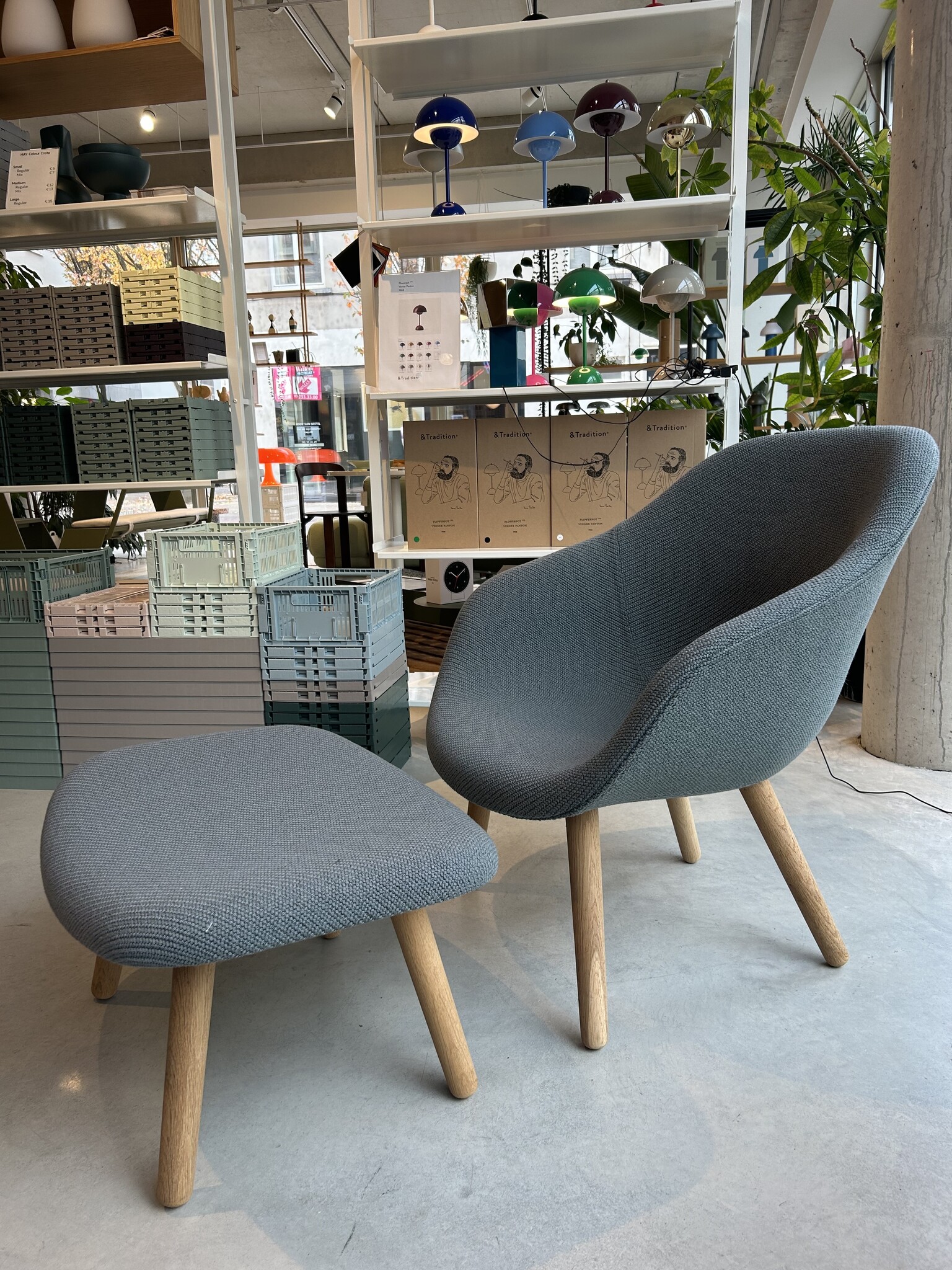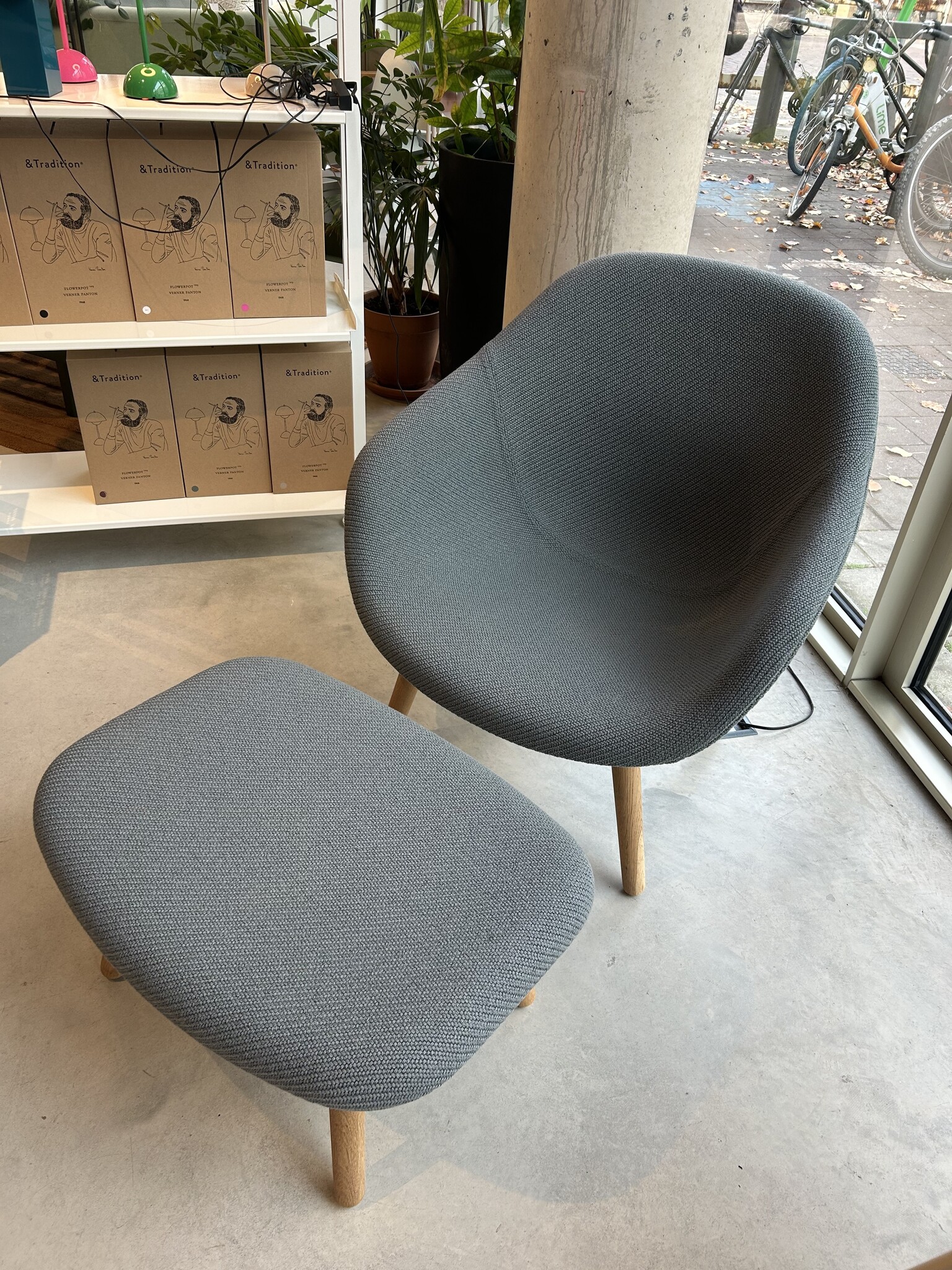 Oak round legs, waxed, full upholstery Coda 962 (cat.6), including footstool 66 x 50 x h 32 cm (cat. 6)