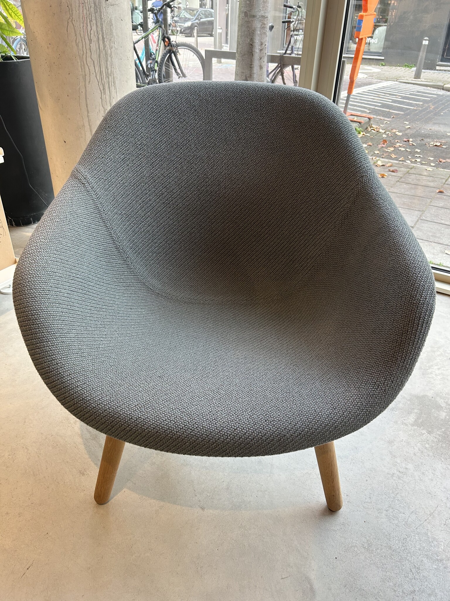Armchair with round wooden legs.