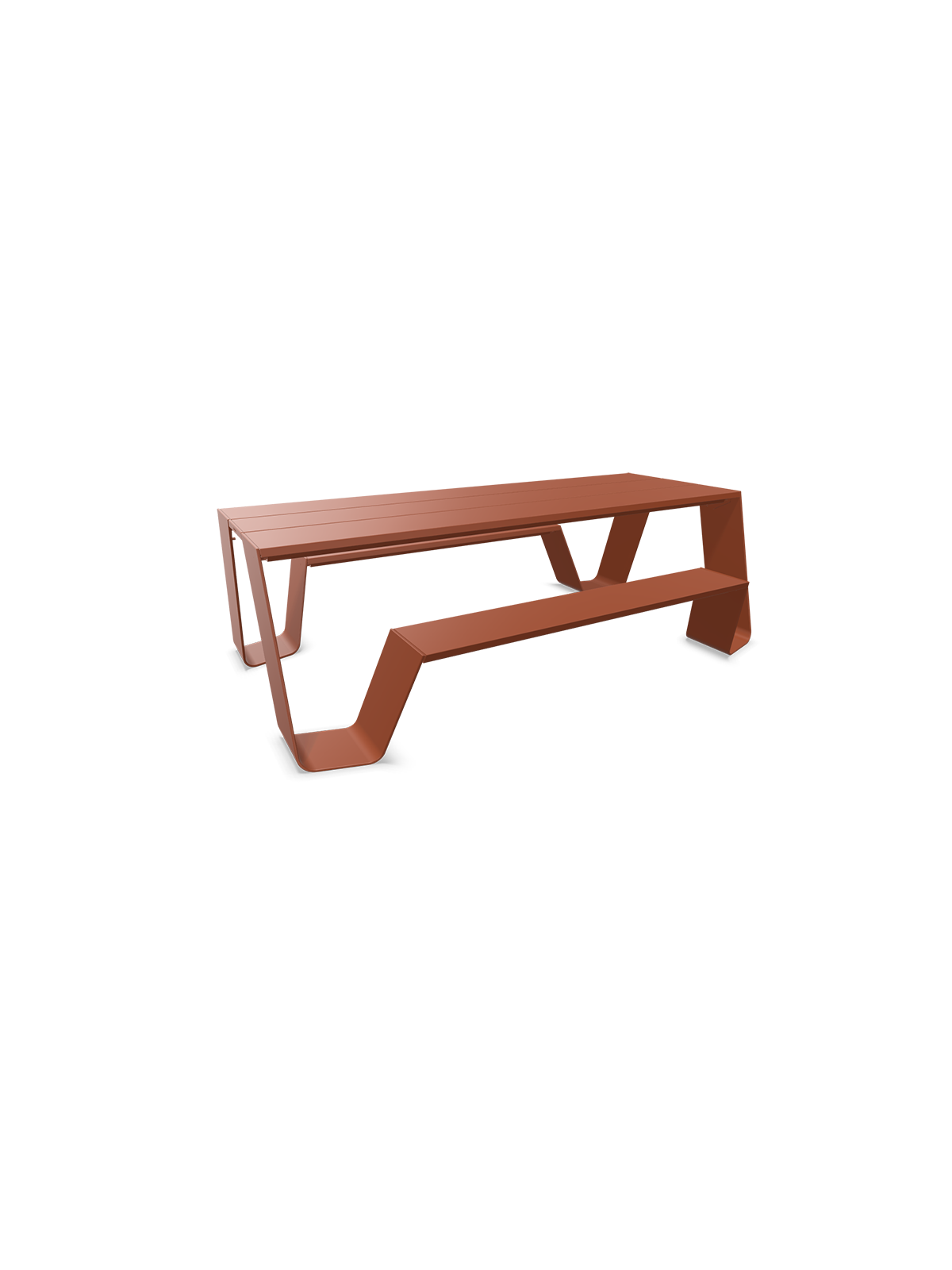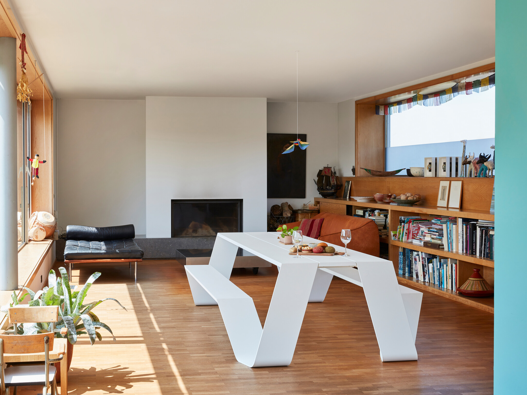A picnic table at heart, this piece adds a playful yet architectural element to any indoor space or outdoor terrace.