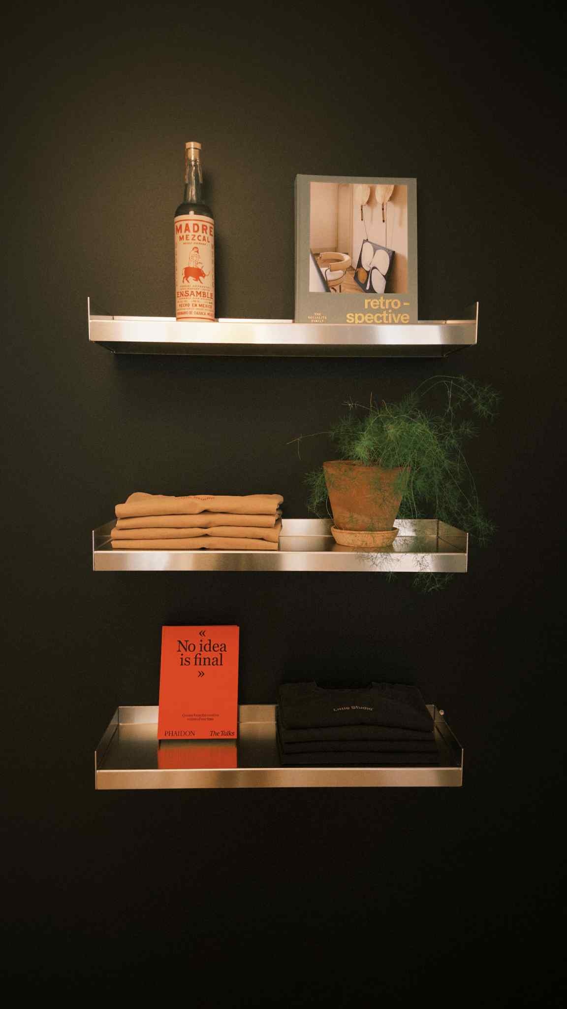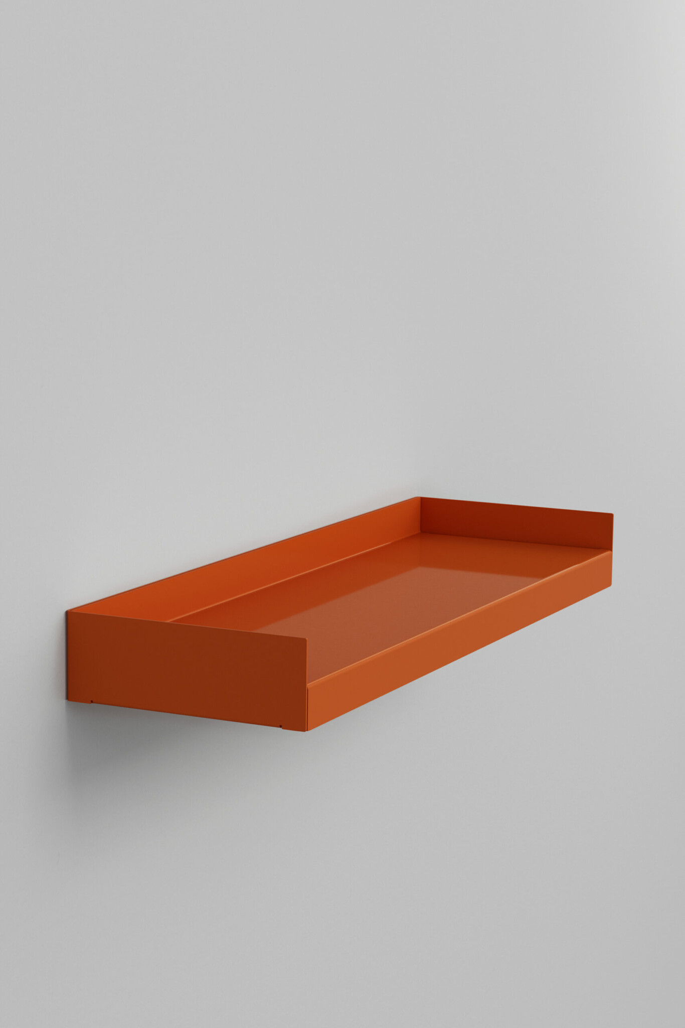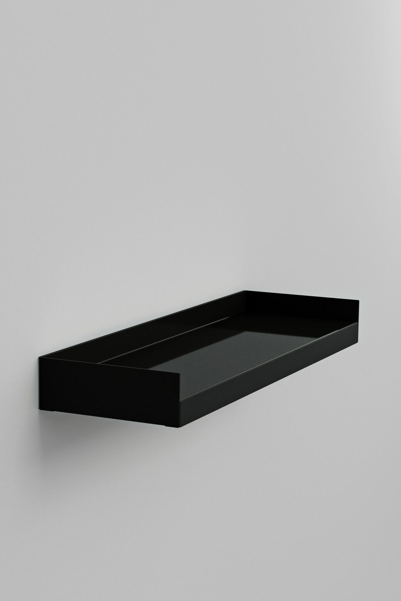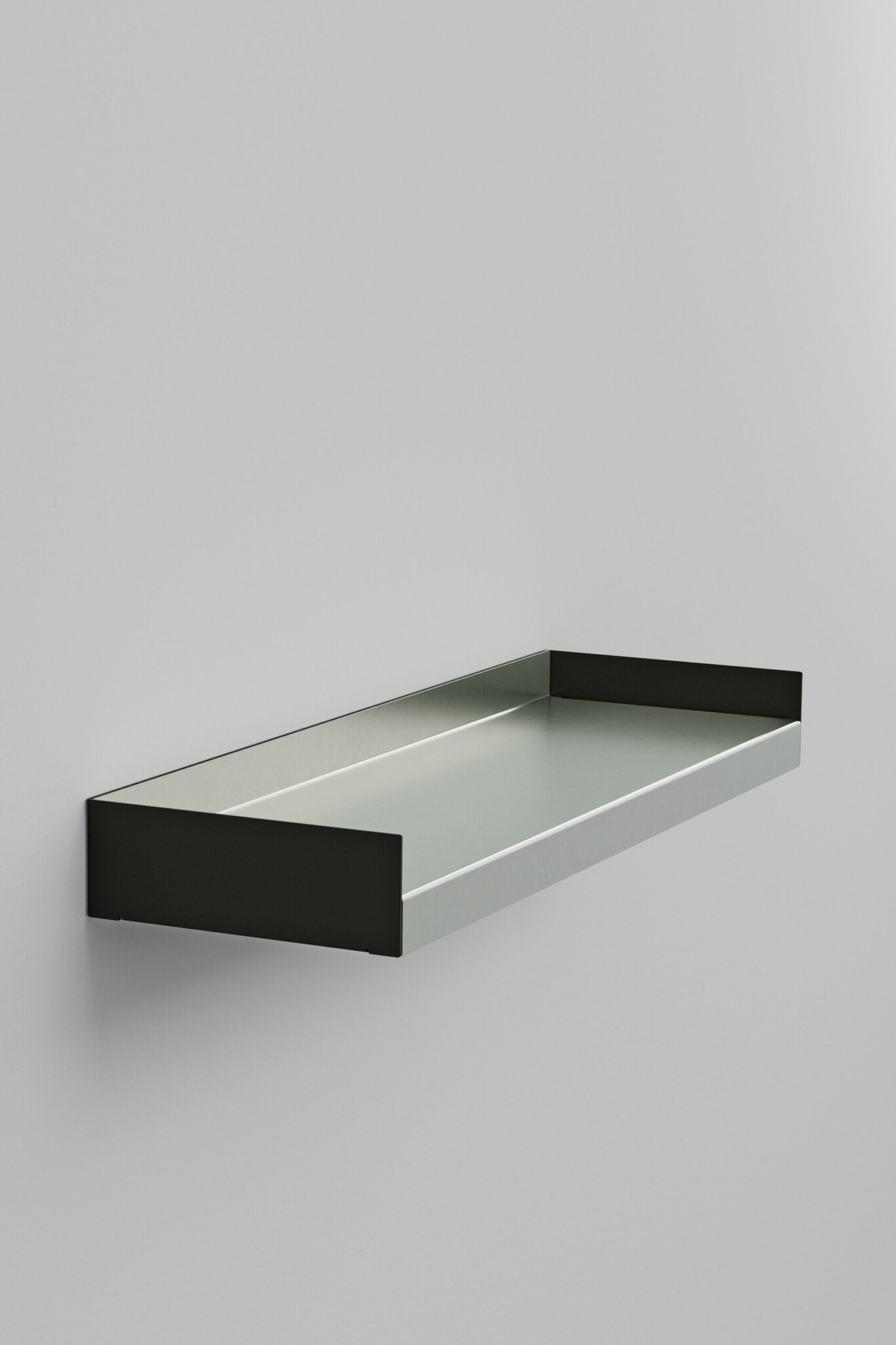 KOMPAKT is a floating wall shelf made from two folded metal sheets, forming a monolithic piece inspired by the architectural interplay of fine and bold lines.