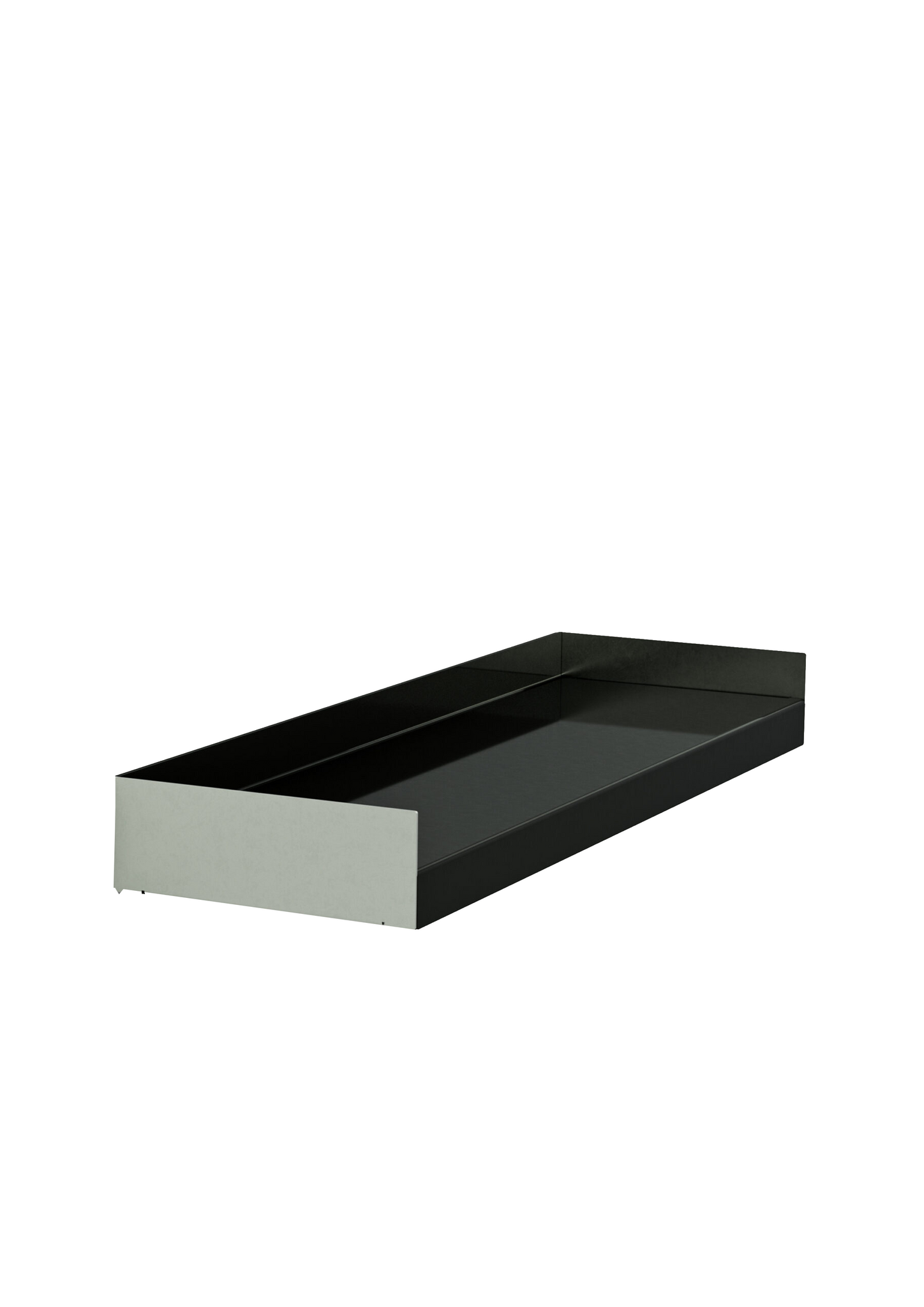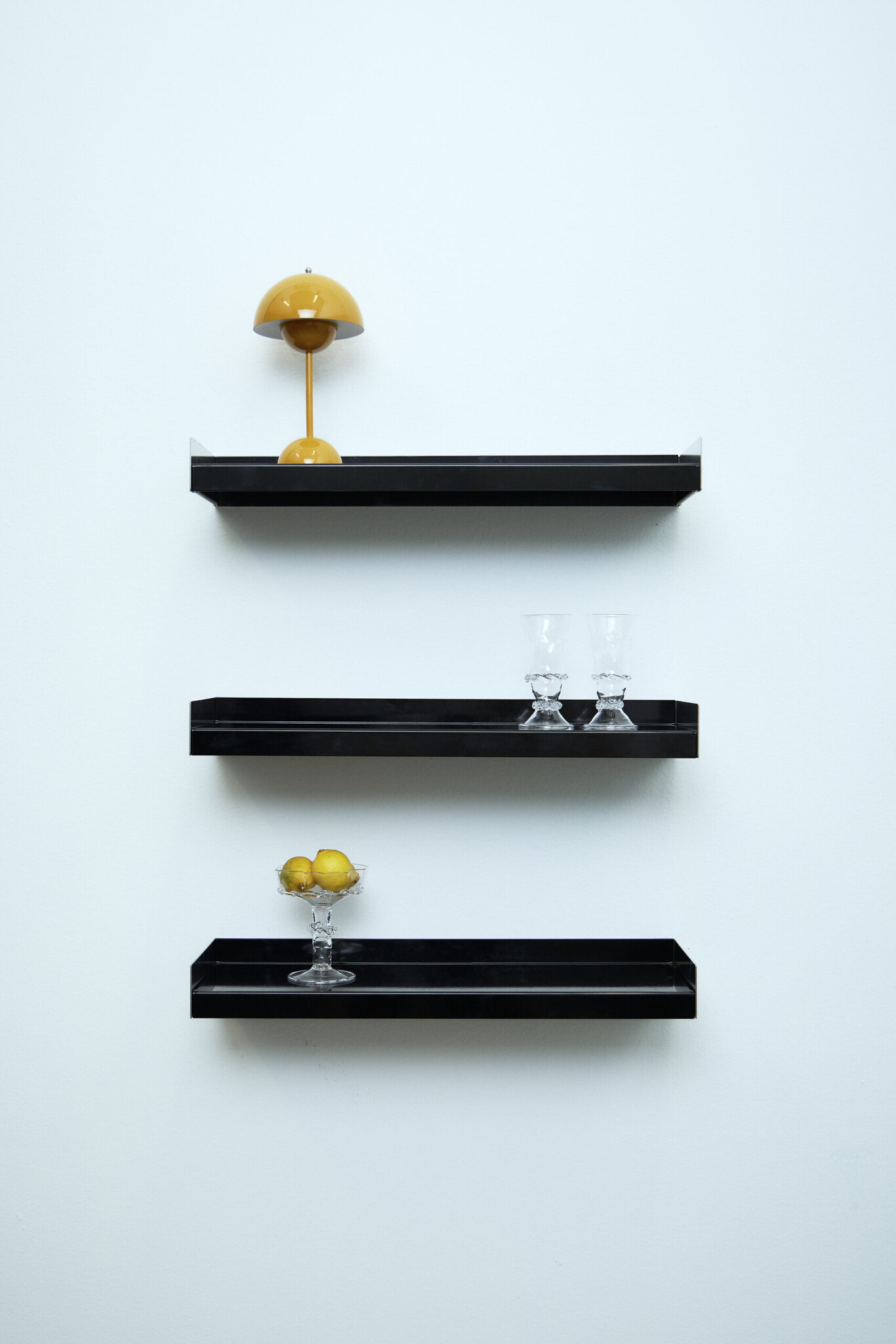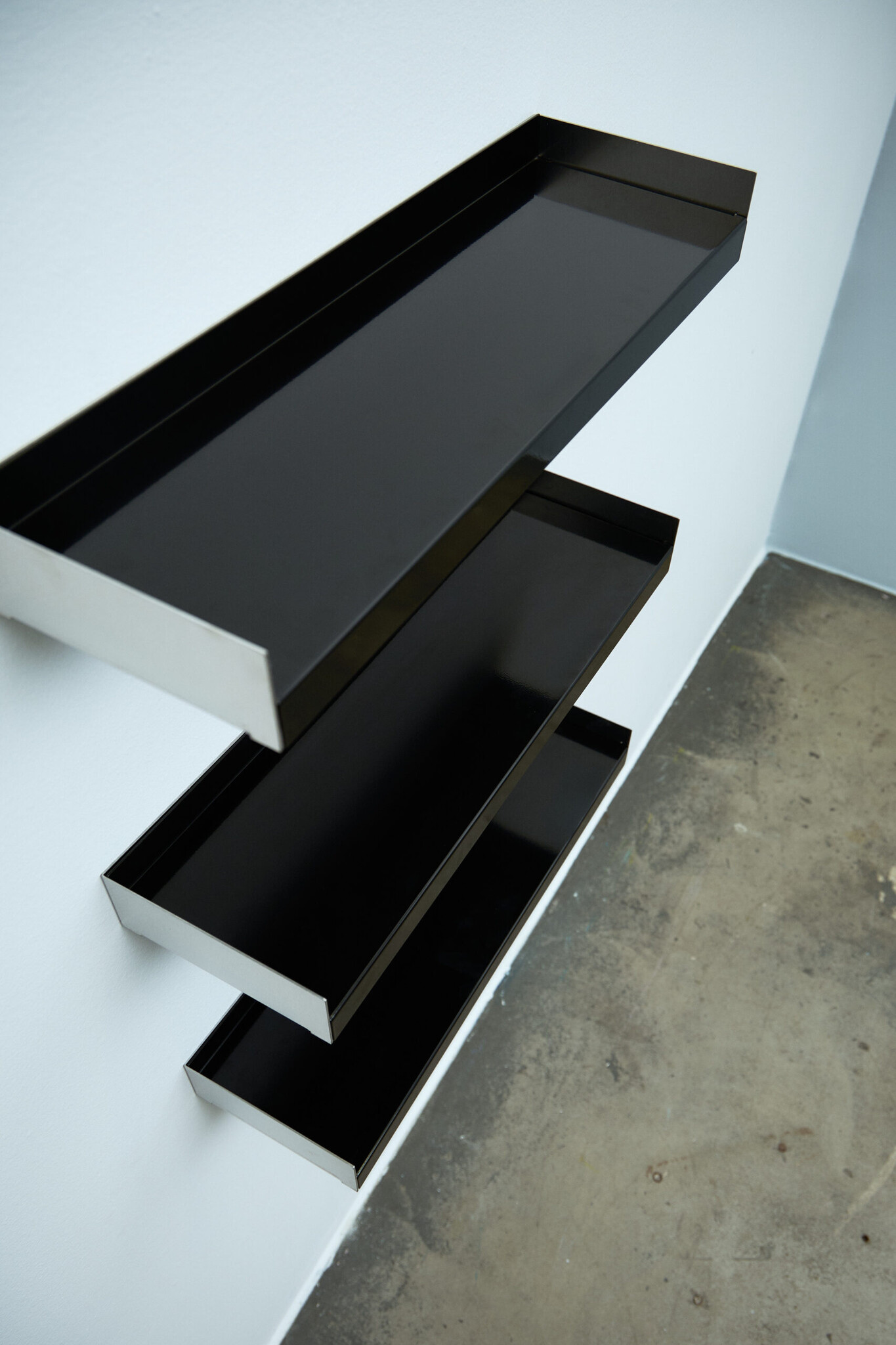 KOMPAKT is a floating, single wall shelf created from two folded metal sheets, forming a monolithic piece inspired by the architectural interplay of fine and bold lines.