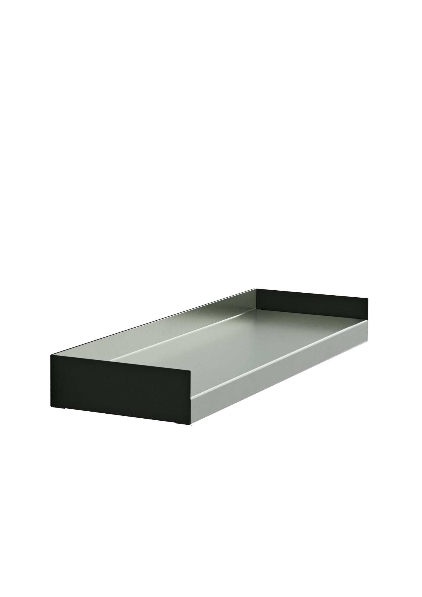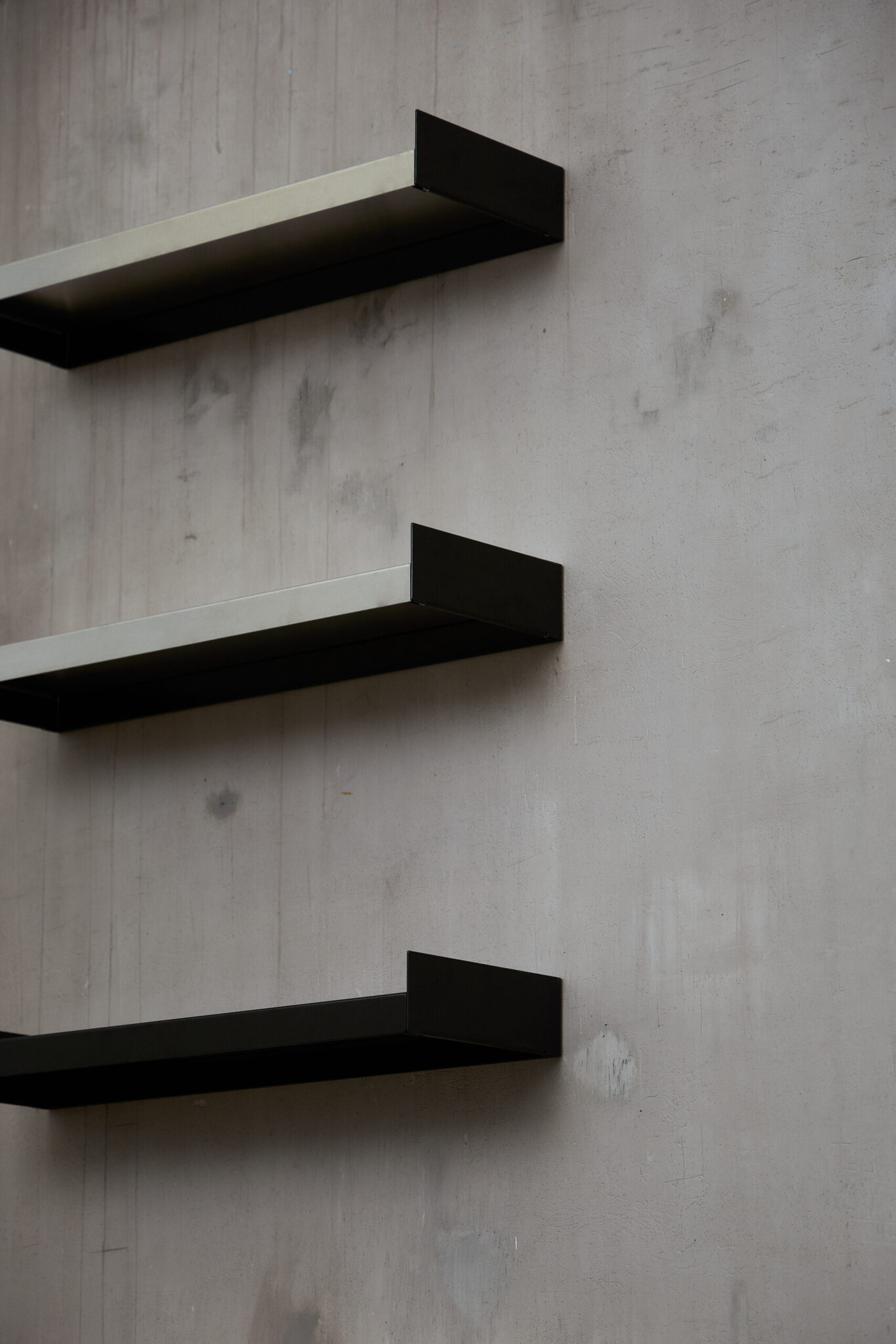 KOMPAKT is a floating, single wall shelf created from two folded metal sheets, forming a monolithic piece inspired by the architectural interplay of fine and bold lines.