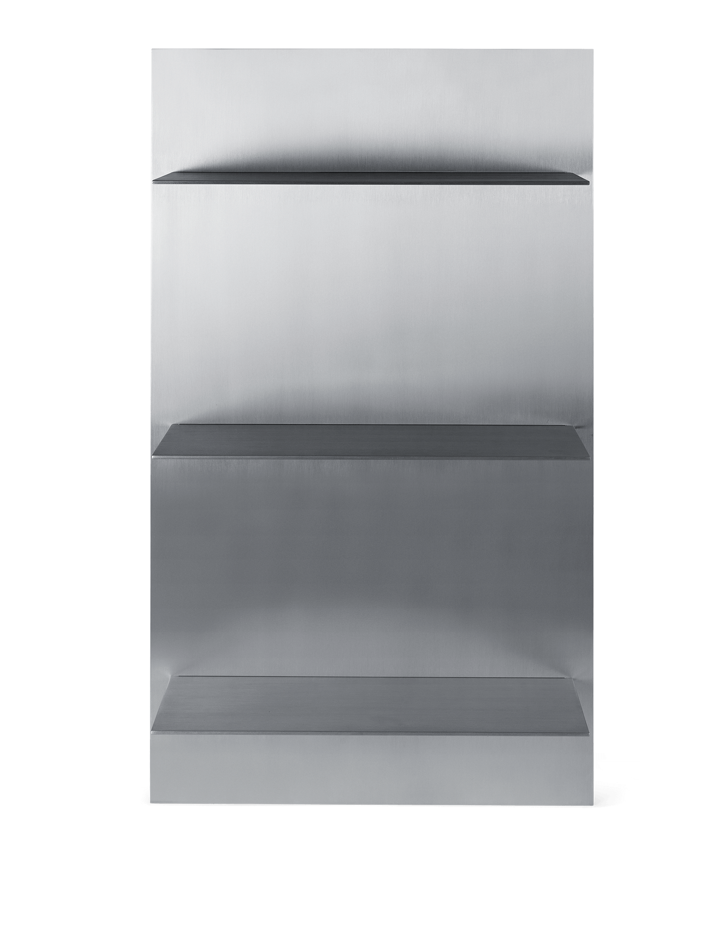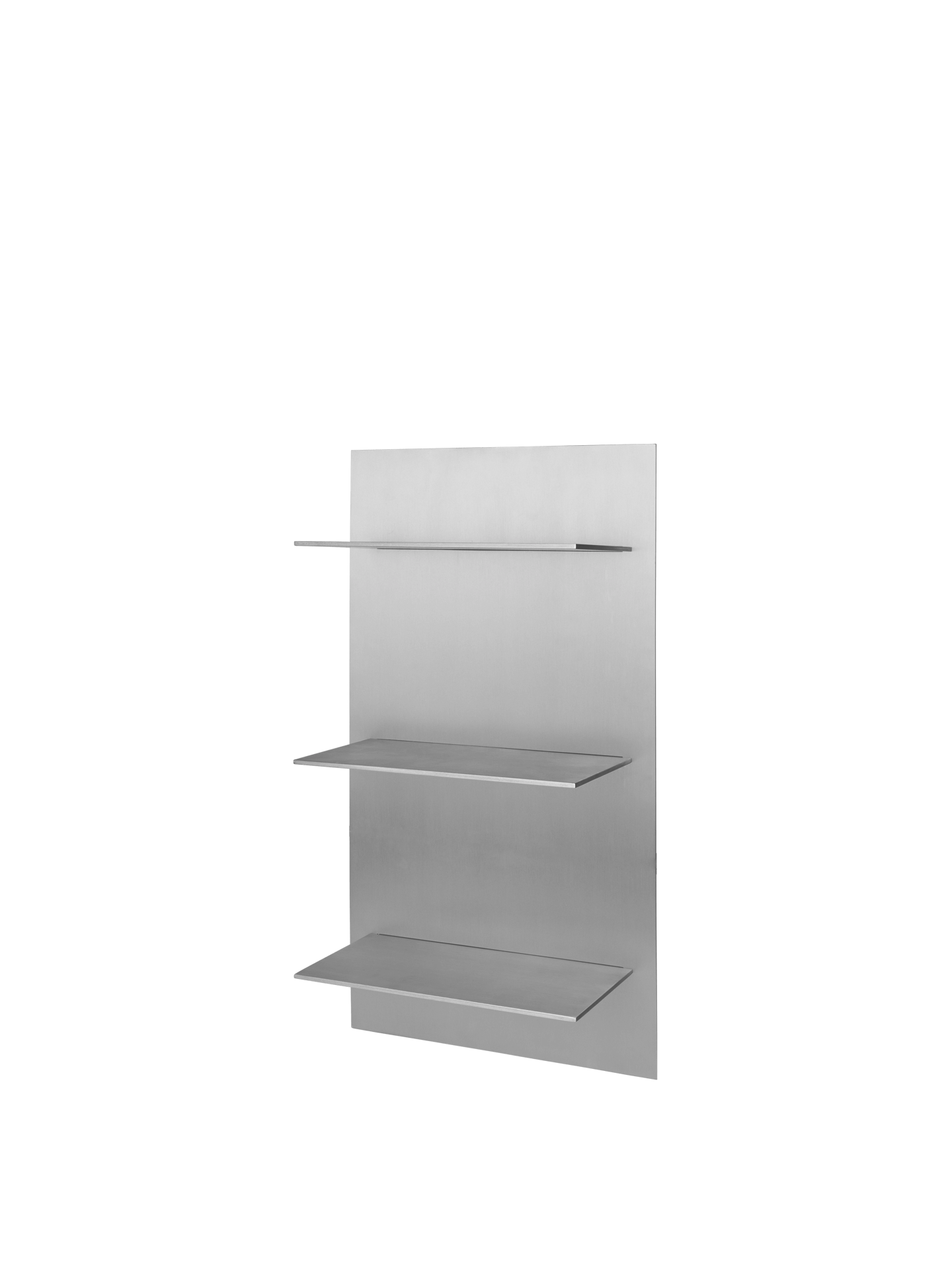 The Lager Wall Shelf in its triple vertical format offers a clean and considered approach to wall-mounted storage. Crafted from brushed aluminum with subtle industrial cues, it provides a compact storage solution for smaller spaces, perfect for glassware, objects, or everyday items. The shelf can be easily stacked with other units to create a cohesive display.