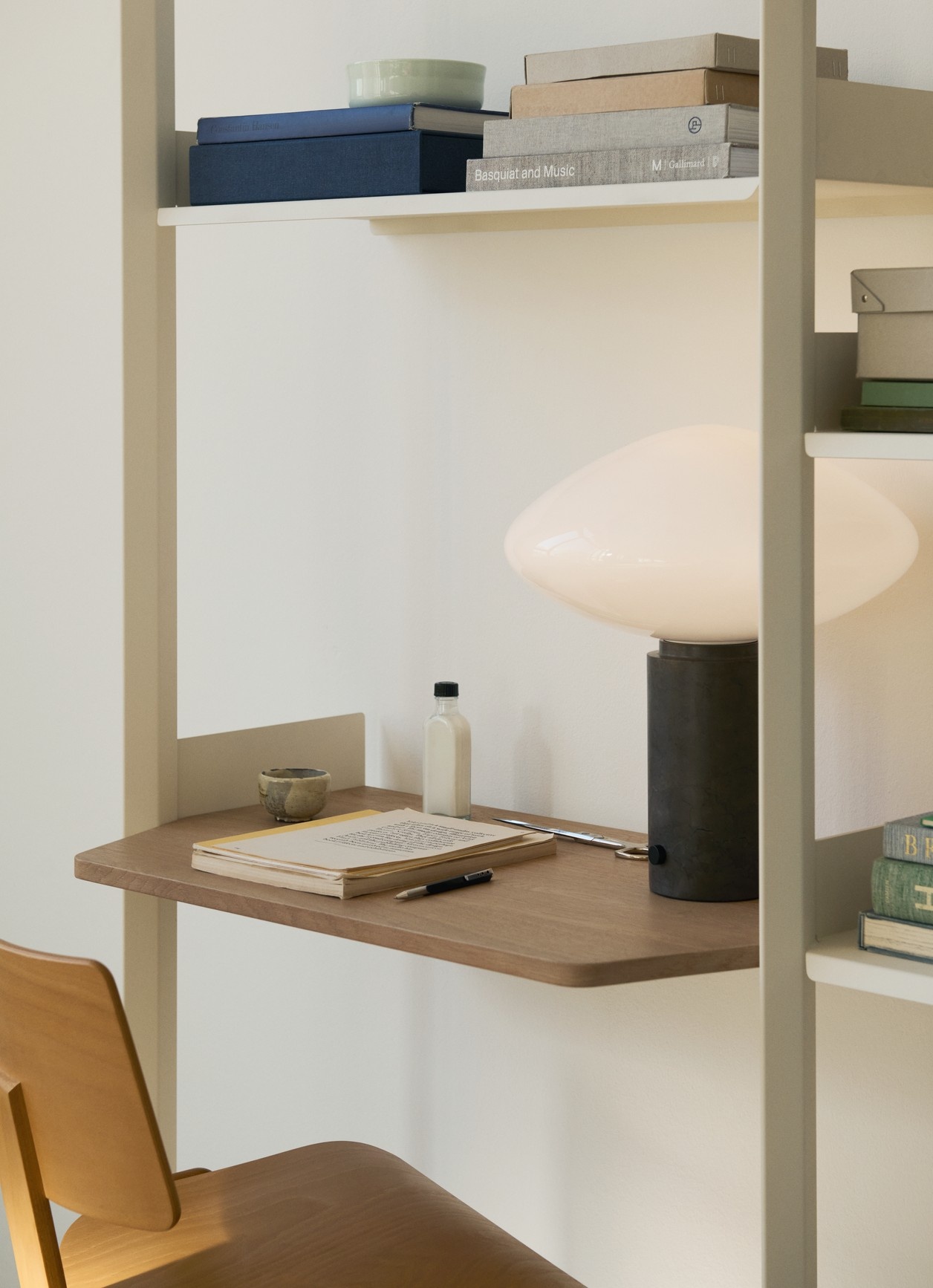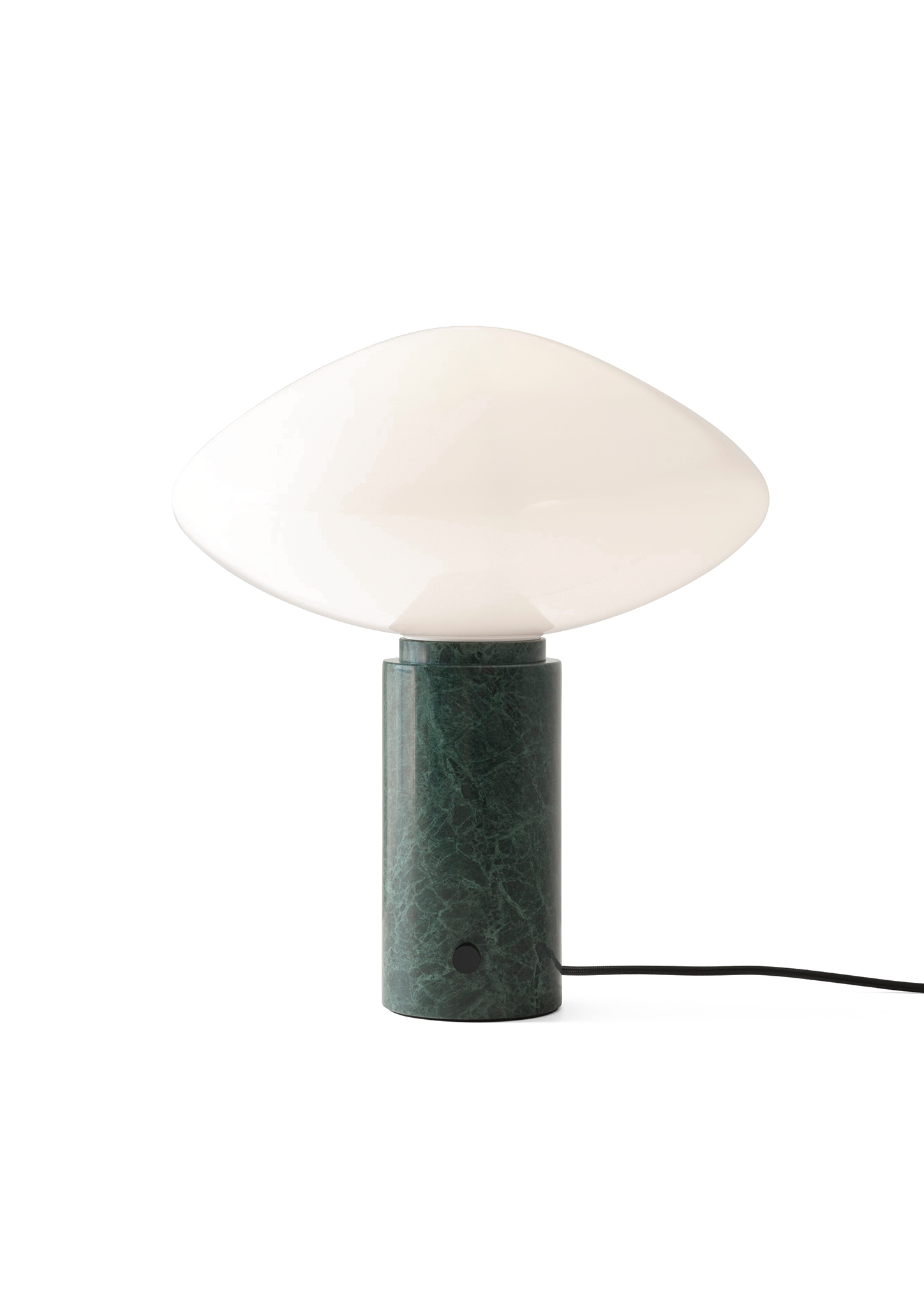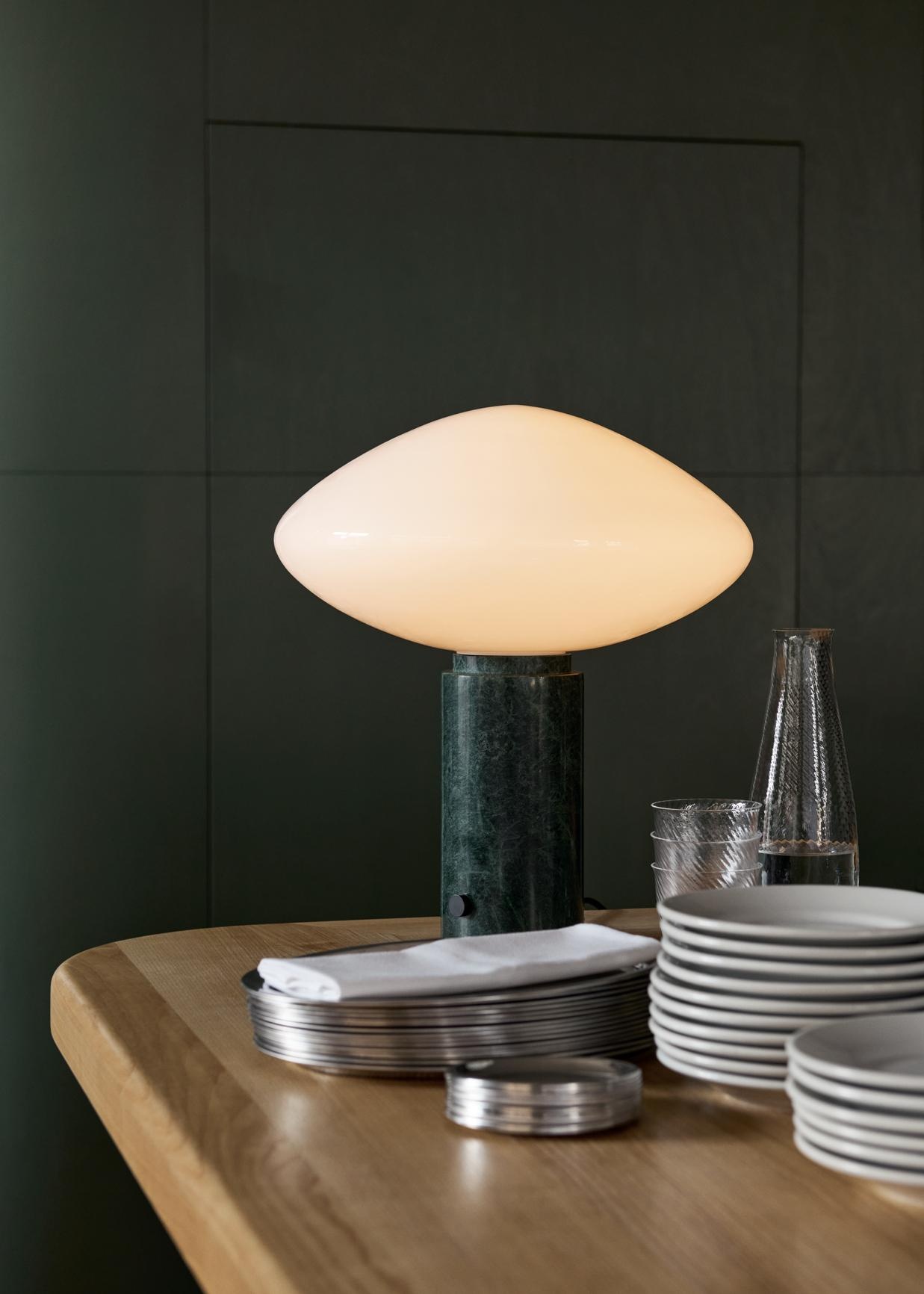 Centered around a mouth-blown opal glass shade, the Mist Table Lamp combines natural materials and precise craftsmanship. Its solid marble pillar provides a stable, sculptural base, while the discreet dimmer switch allows smooth control of the light’s intensity. The contrast between the soft, diffused glow of the glass and the cool weight of the marble results in a graceful, balanced design that adds quiet sophistication to any interior.