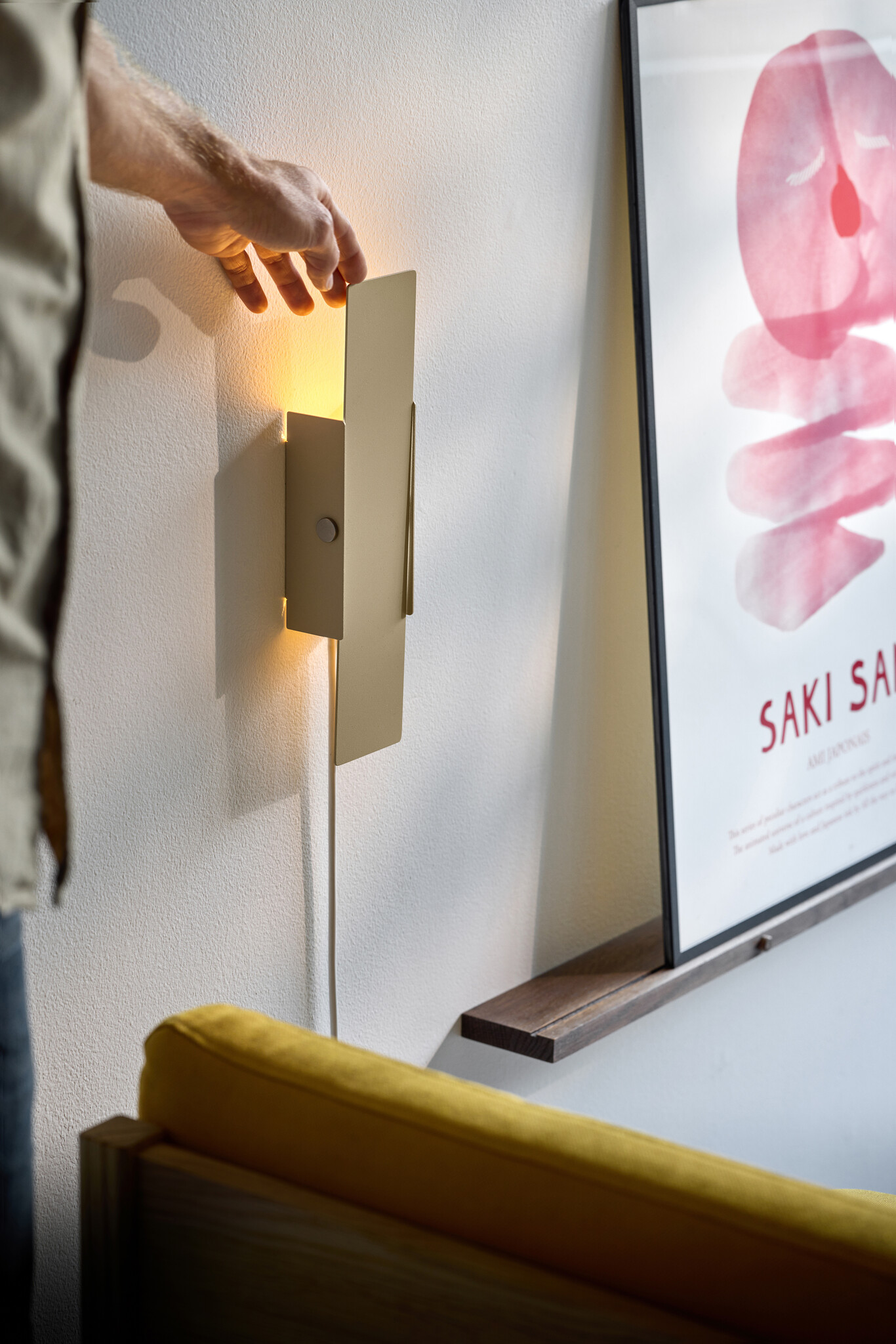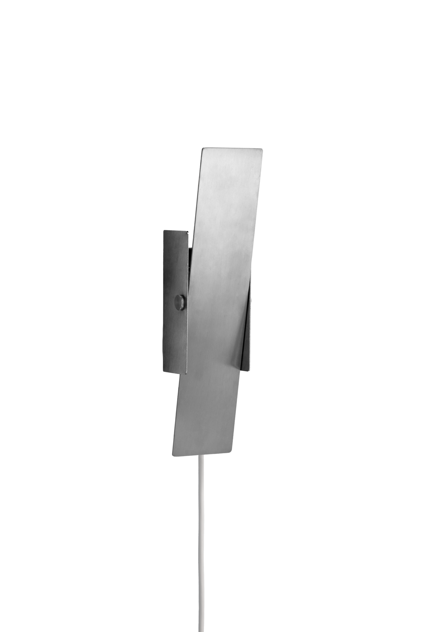 Pivoting Wall Lamp is a sculptural ambient light that lets you adjust both its form and illumination. It consists of two steel sheets: one mounts to the wall, while the other pivots at the centre, directing light upward, downward, or as a blend of both.