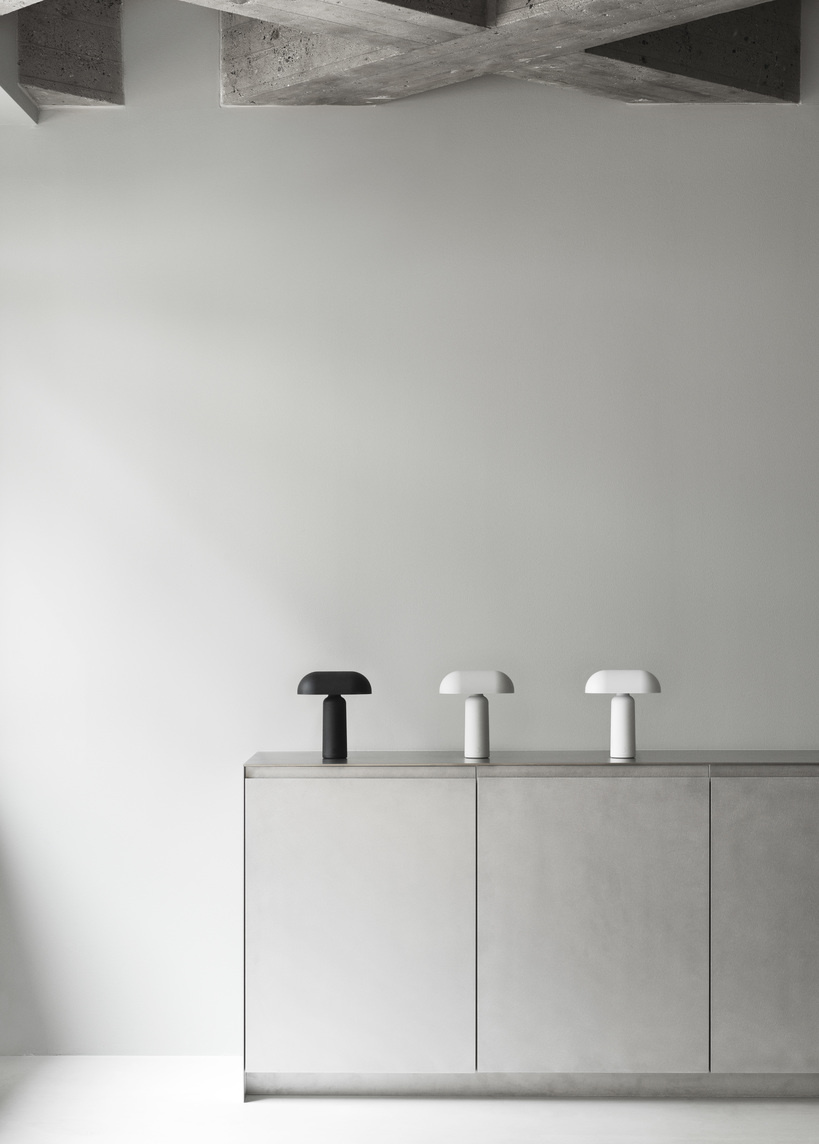 As its name suggests, Porta is the first portable lamp in the collection. Its soft, organic silhouette—featuring a cylindrical base and elongated dome shade—gives it a cohesive, elegant look. The shade is designed to provide warm, ambient lighting in smaller settings. When tilted 90 degrees, it becomes even more compact, fitting easily onto windowsills, small café tables, or bookshelves.