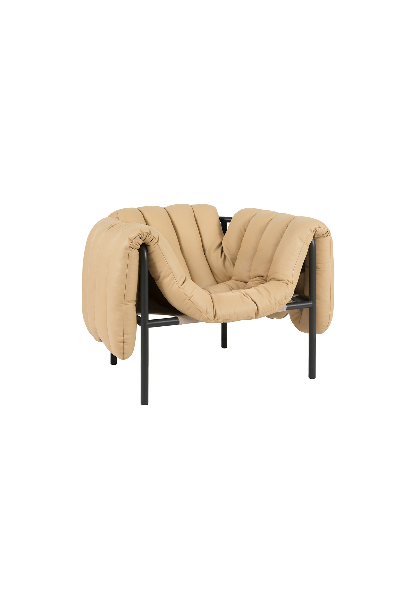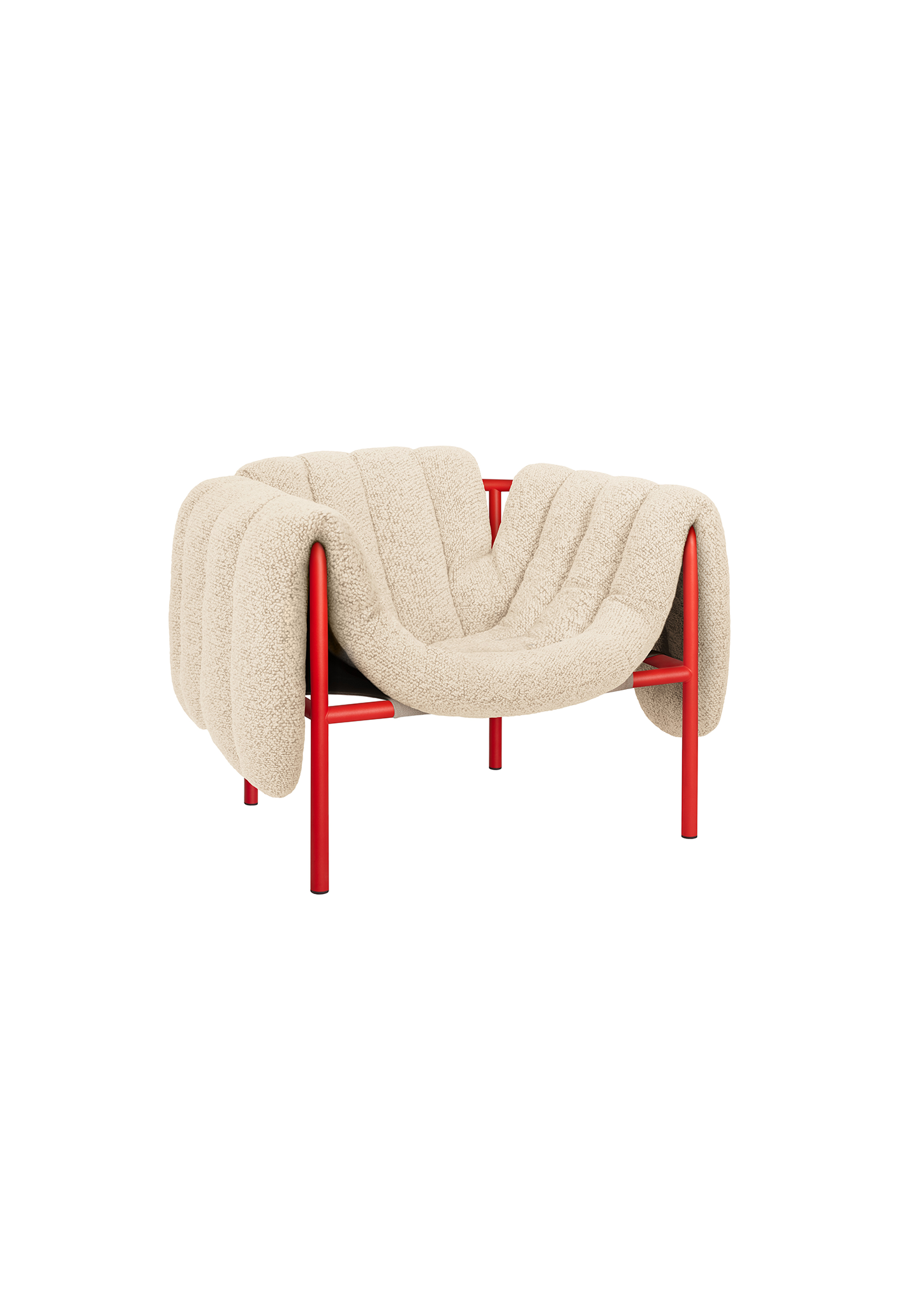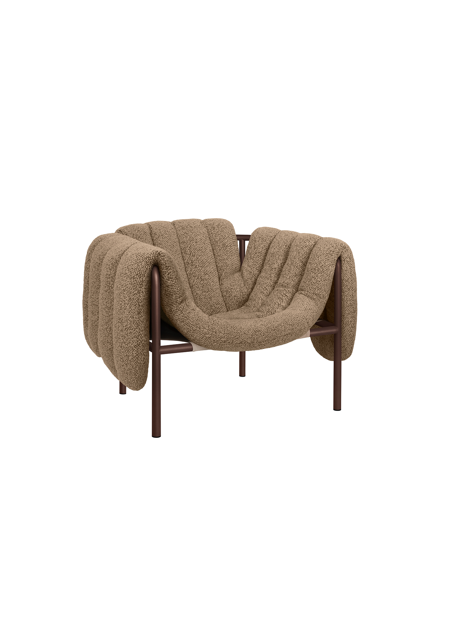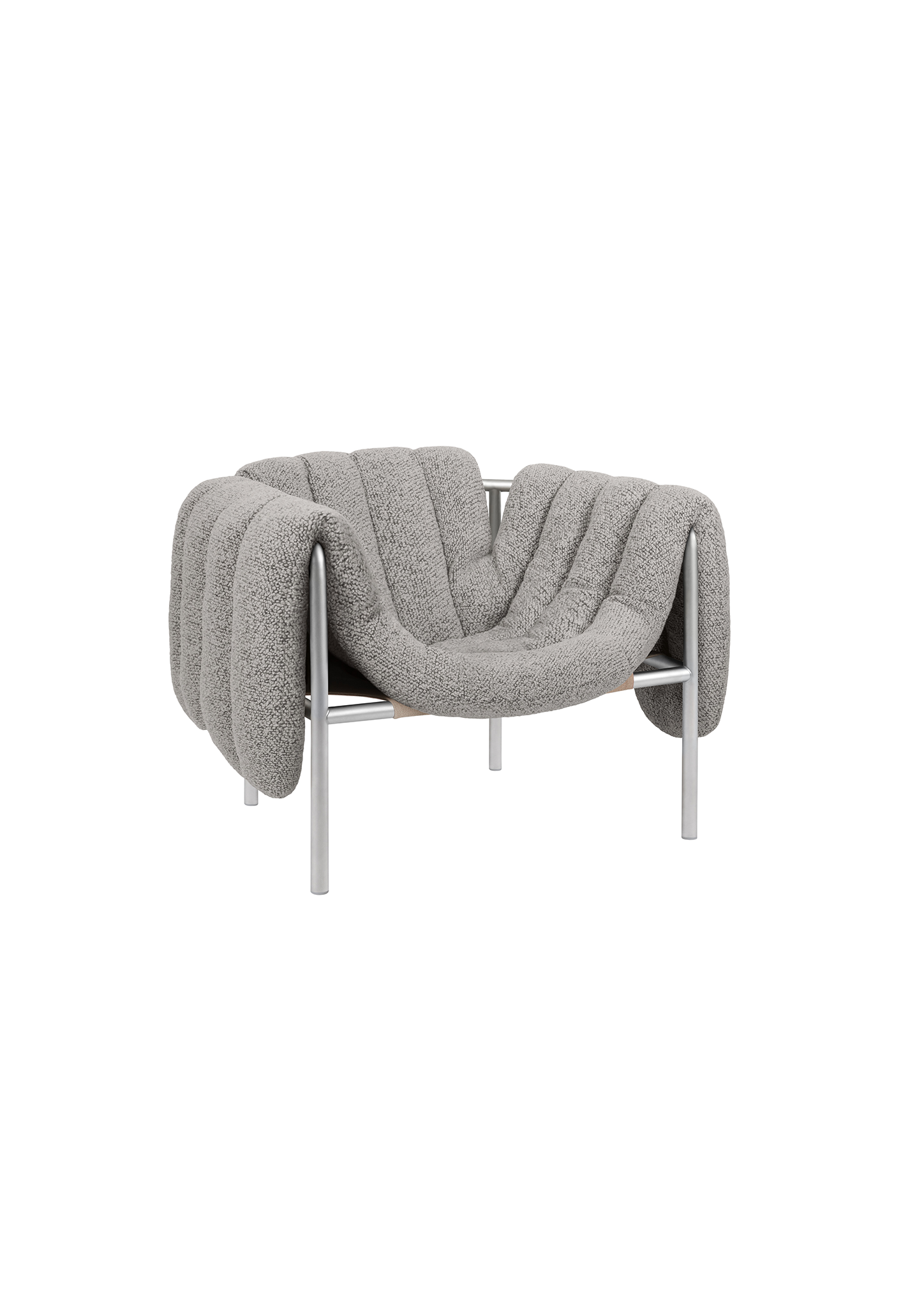 The frame is available in either powder-coated or sand-blasted steel, offering a refined structural base. The upholstery comes in a variety of rich textures, including thick canvas, chunky bouclé, or luxurious leather, allowing the chair to adapt to different interiors and atmospheres. With its blend of visual generosity and sculptural clarity, the Puffy Lounge Chair is both a statement piece and an inviting retreat.