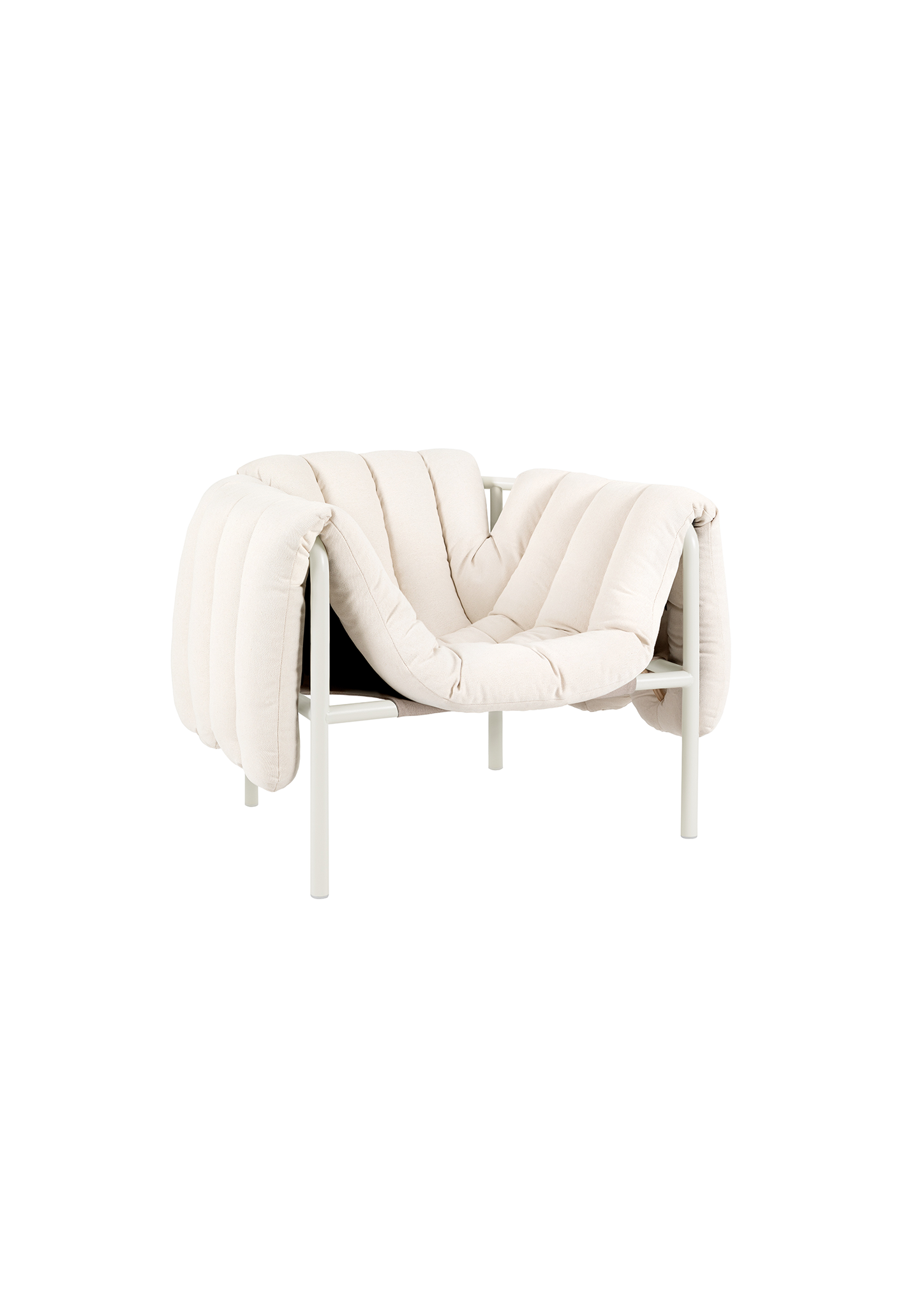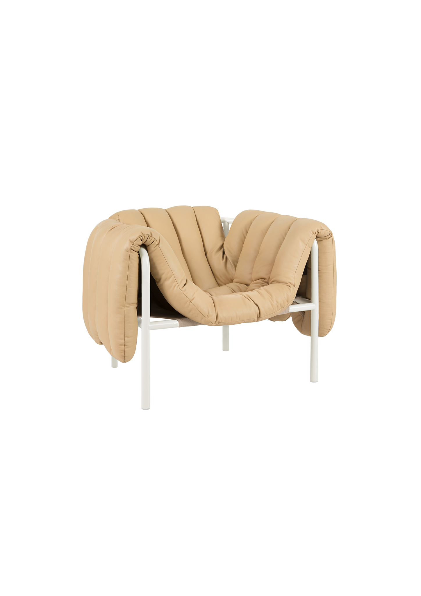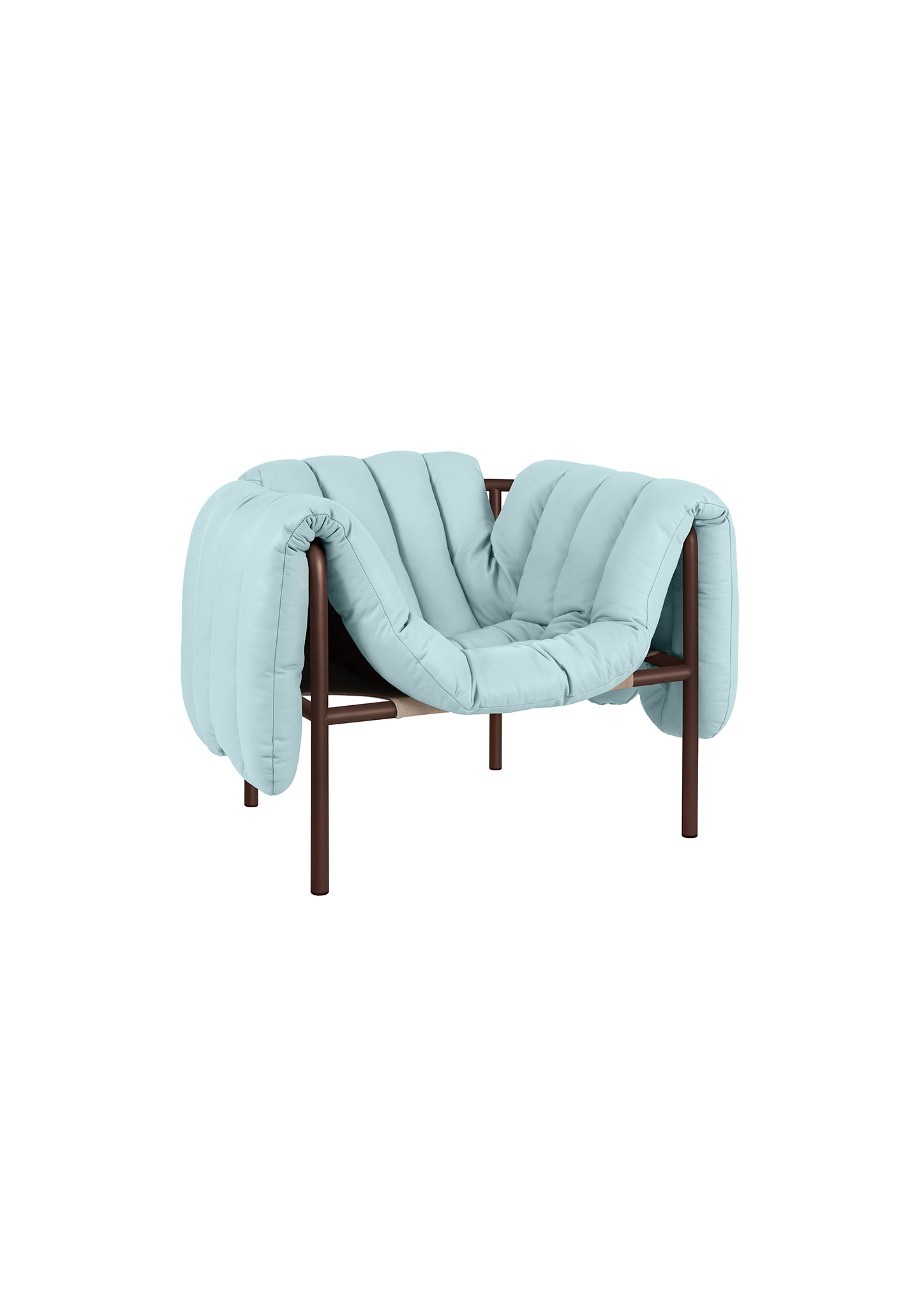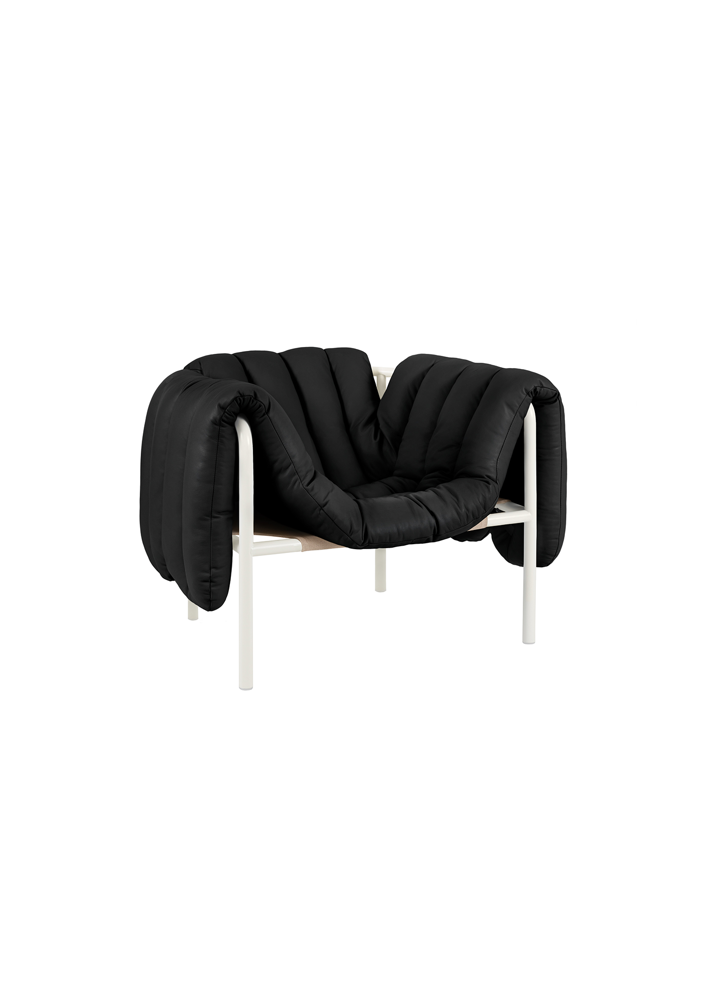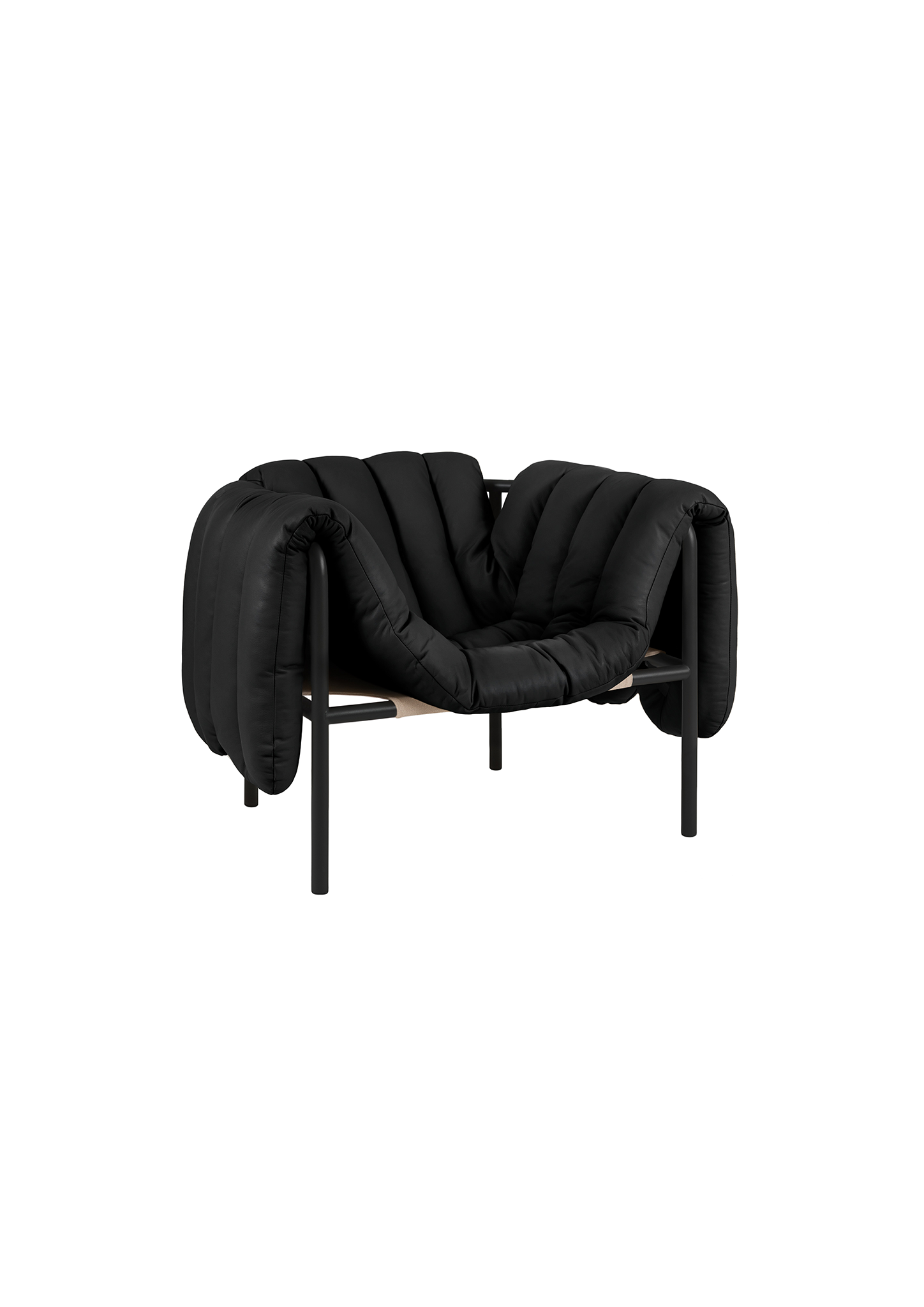 The frame is available in either powder-coated or sand-blasted steel, offering a refined structural base. The upholstery comes in a variety of rich textures, including thick canvas, chunky bouclé, or luxurious leather, allowing the chair to adapt to different interiors and atmospheres. With its blend of visual generosity and sculptural clarity, the Puffy Lounge Chair is both a statement piece and an inviting retreat.