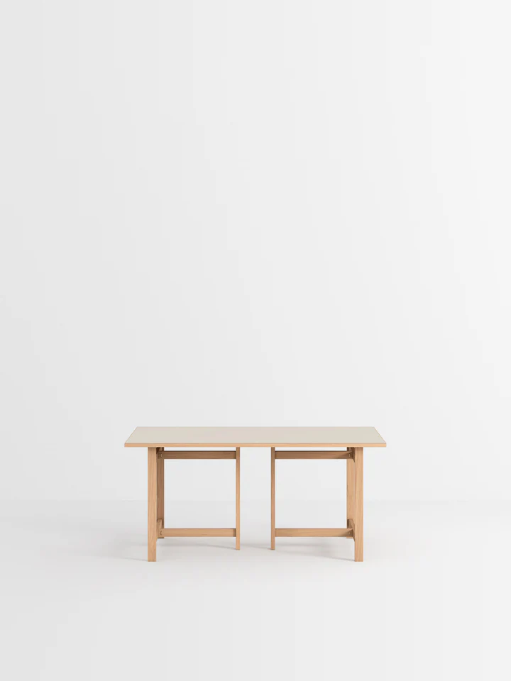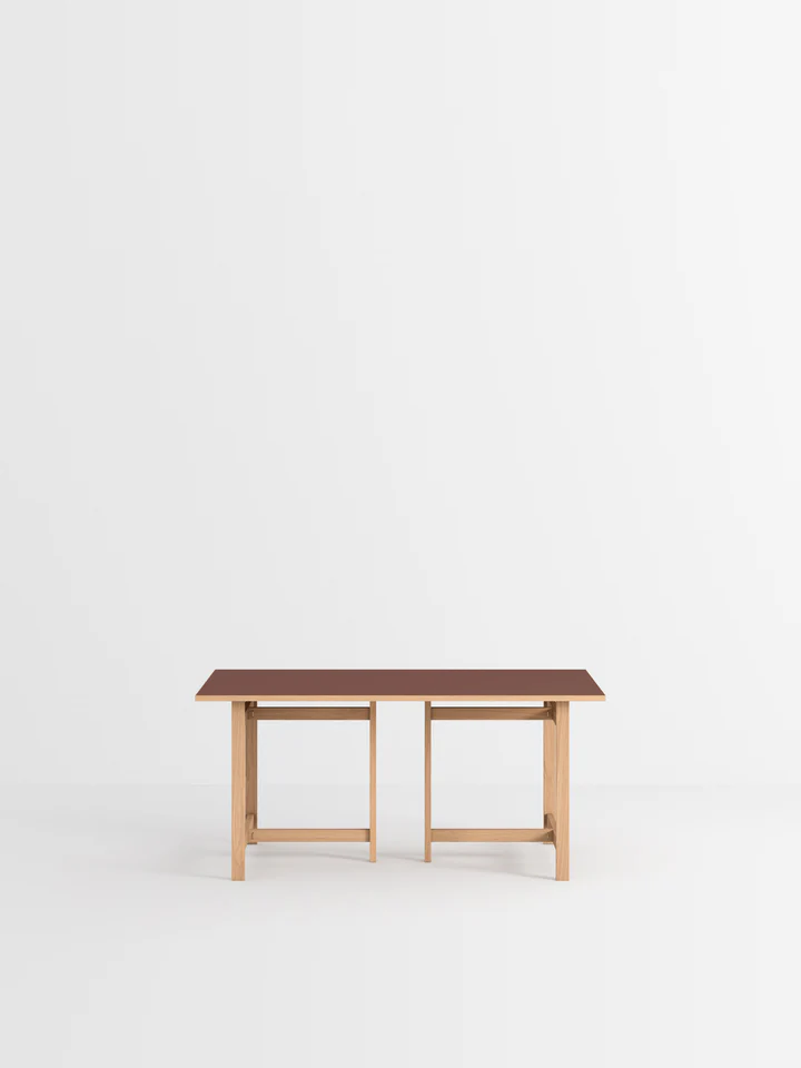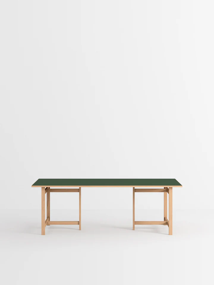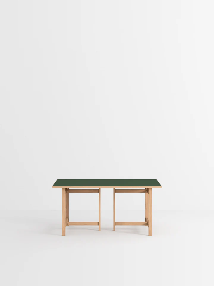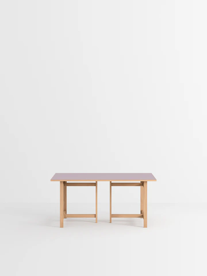 The table is available in two lengths and four finishes. Choose from solid oak or coloured linoleum, all FSC-certified and made in Europe. Extensions are available for every finish.
