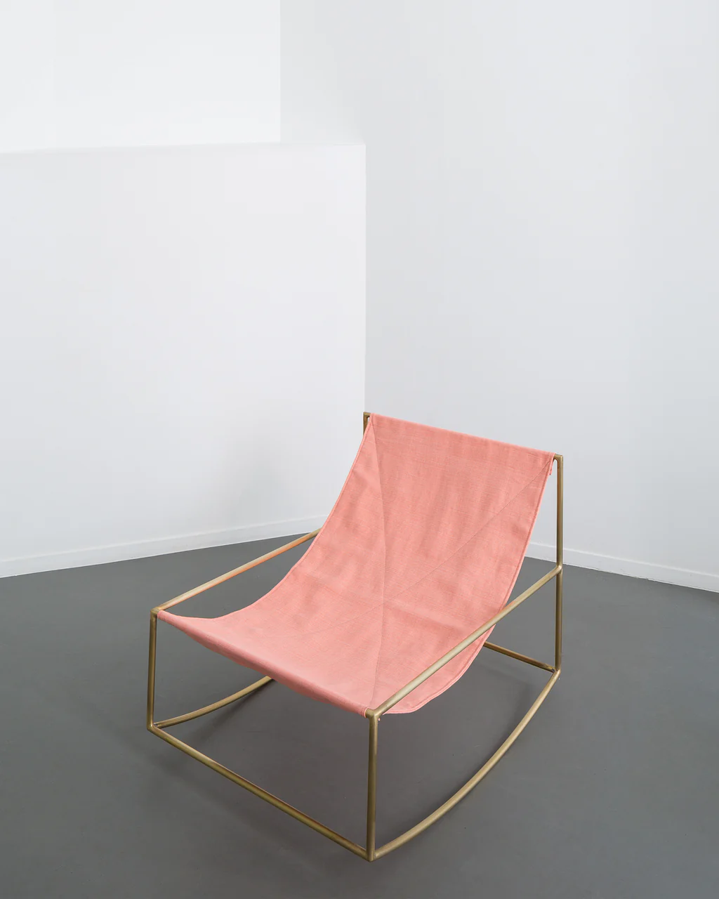 From now on, garden lounging can be done in true aesthetic style. valerie_objects introduces an outdoor version of Muller Van Severen’s rocking chair – perhaps one of the purest rocking chair designs ever created. The frame, made of electrolytically polished stainless steel, and the fabric seat are both crafted from premium, weather-resistant materials. This makes the chair perfectly suited for indoor as well as outdoor use. The vibrant color palette, unmistakably Muller Van Severen, brings character and life to any outdoor setting while preserving the brand’s signature sense of minimalism and playfulness.