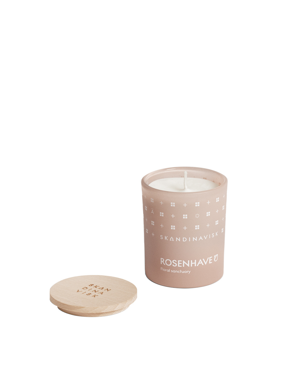 A perfume and Swedish rapeseed wax blend in painted glass with a pure cotton wick and engraved beechwood lid. Our local Swedish rapeseed wax is sustainably farmed, traceable and non-GMO for the lowest environmental impact. Place candle on lid when lit to help protect from sensitive surfaces, and as a snuffer to extinguish the flame. Painted glass designed to be reused for decoration, storage or tealights.