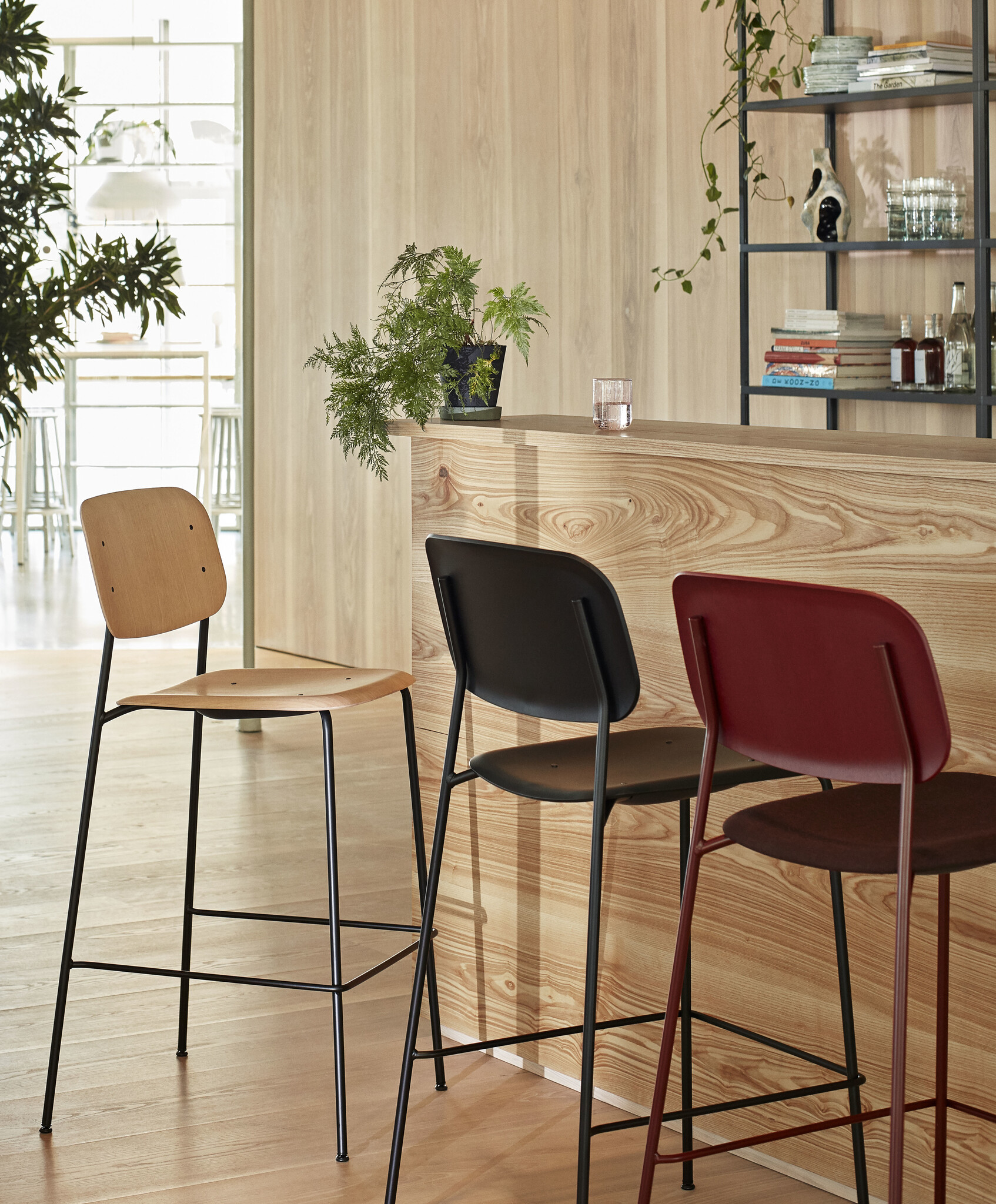 The Soft Edge 90 Bar Stool, designed by Iskos-Berlin, merges organic shapes and minimal aesthetics with a lightweight design and a supportive low backrest. Featuring a wooden seat and back in various finishes, combined with long steel legs, it delivers a sleek, airy look. Built for durability and comfort, it suits cafés, offices, and contemporary homes.
