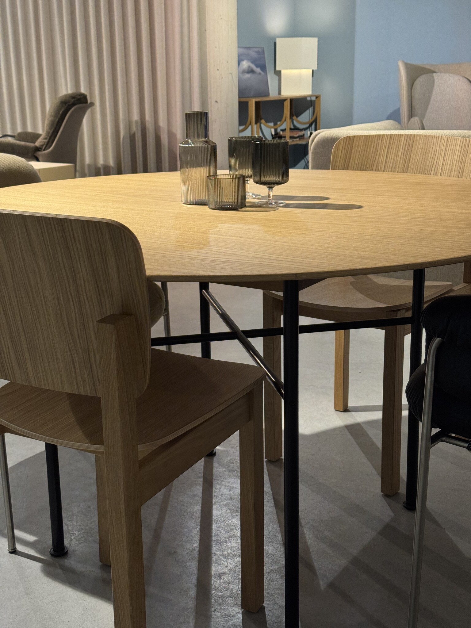 The wooden top rests on slim metal legs, balancing warmth and elegance. Its lightweight construction adds visual clarity and suits both modern and classic interiors. Supper Round combines functionality, comfort and Scandinavian design in a timeless expression.