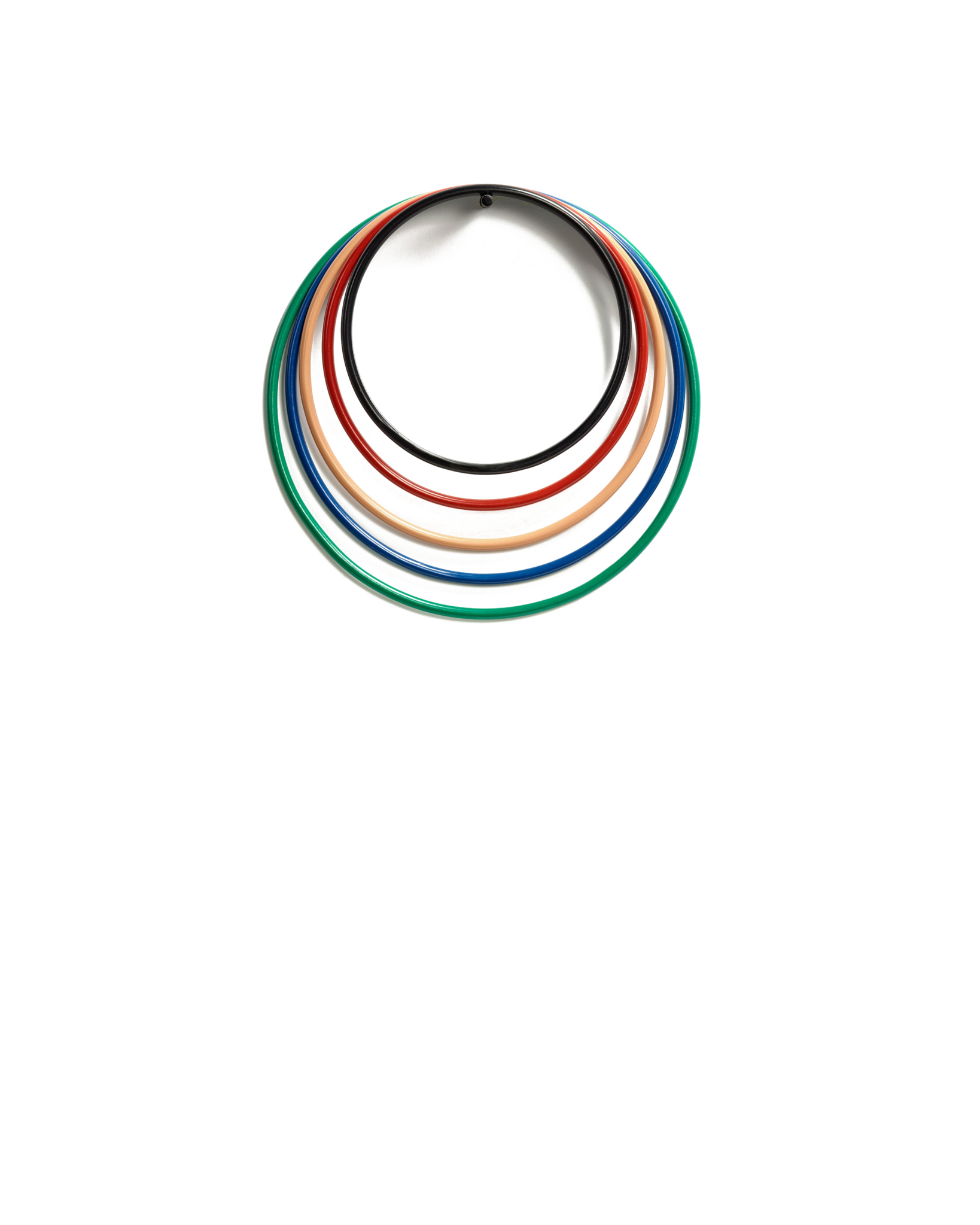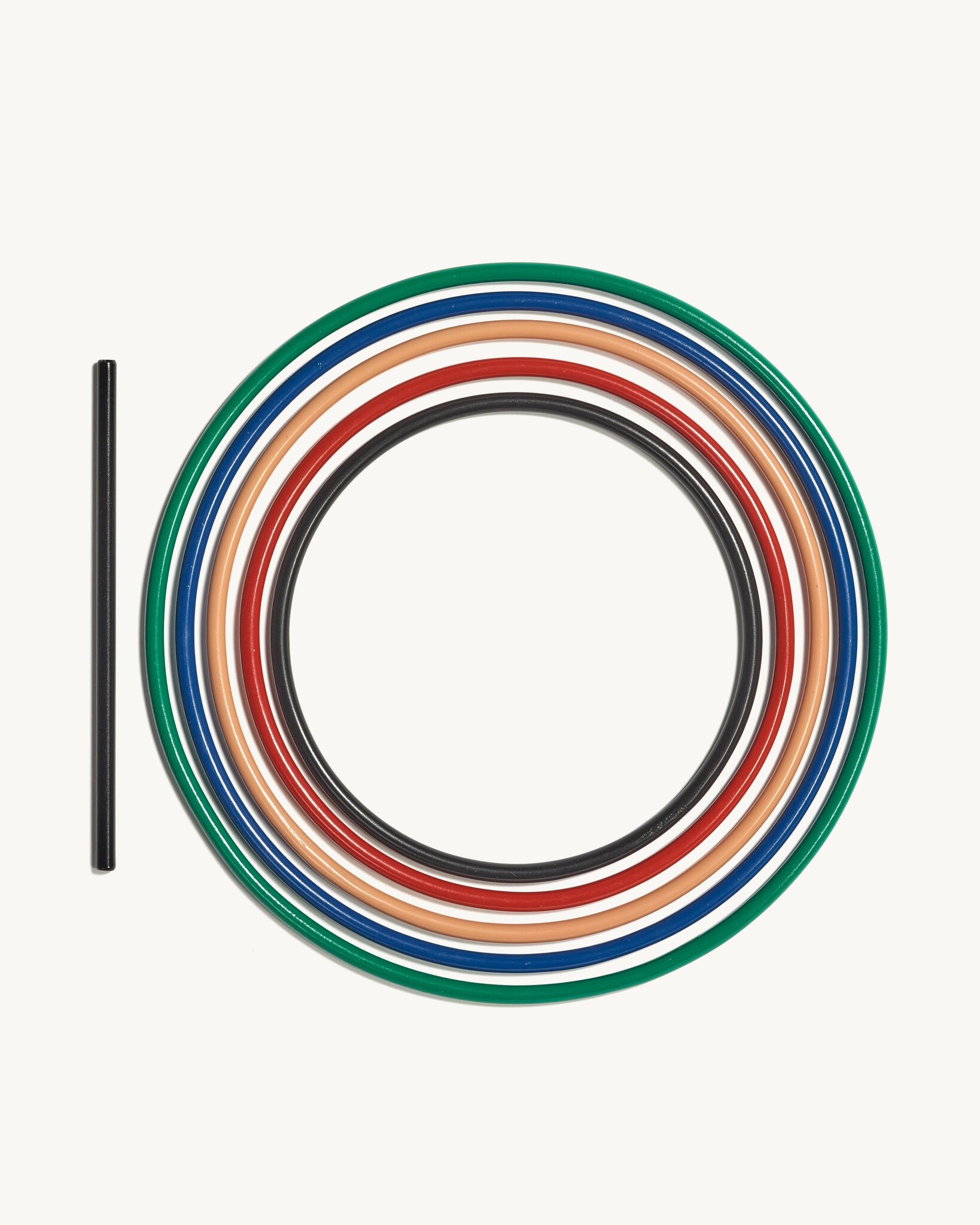 Today, they redraw the composition. The new collection consists of five simple circles in pastel and bright hues, creating a colorful yet minimalistic composition of concentric rounds — think of it as a bangle for the kitchen wall.