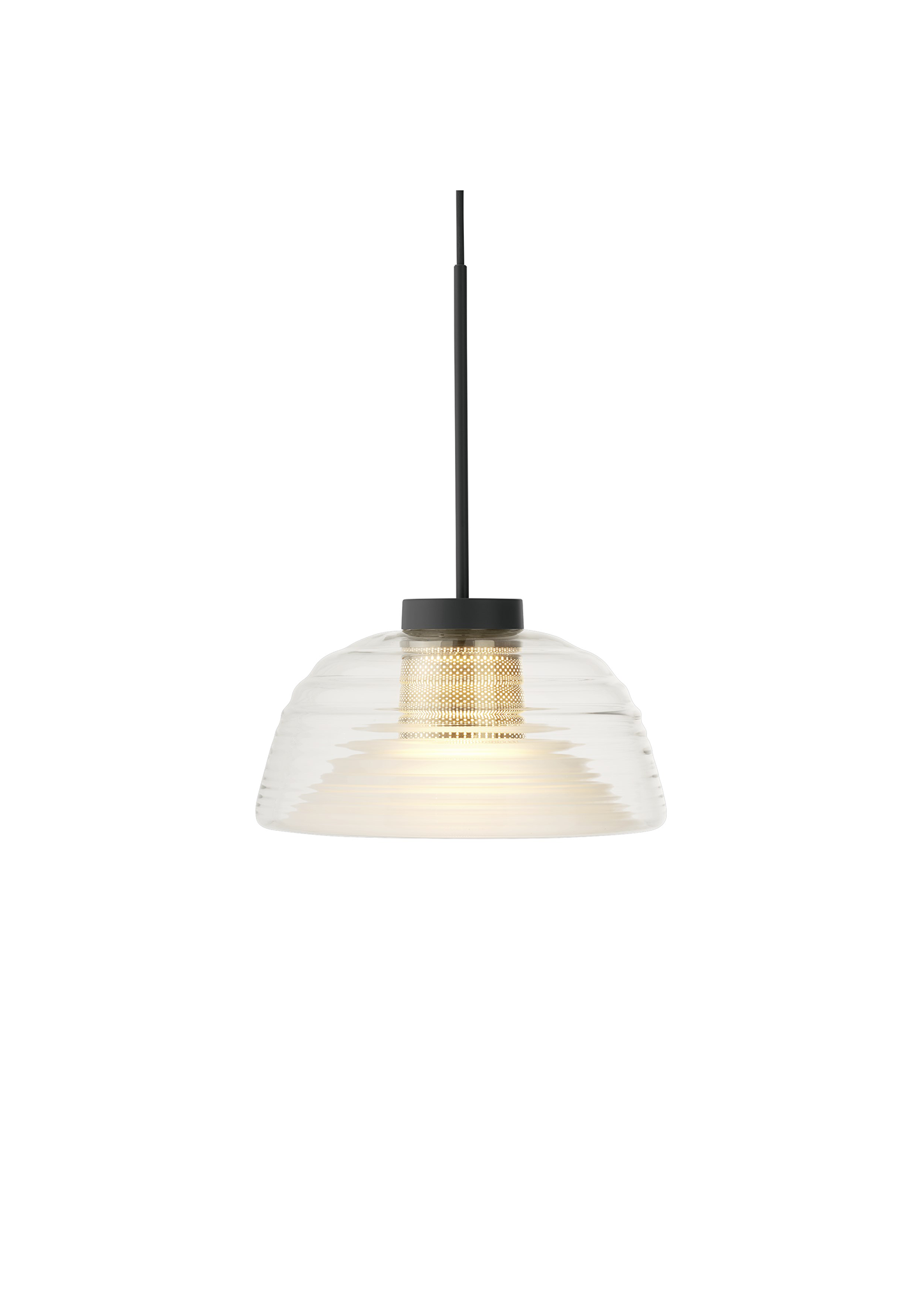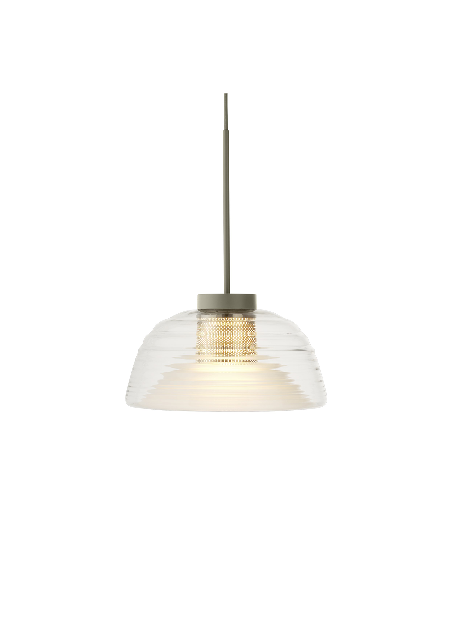 Its design features mouth-blown glass with a rippled texture that creates unique optical effects from different angles. By combining clear and frosted glass with a perforated steel mesh, the lamp provides ample, soft, and glare-free illumination.